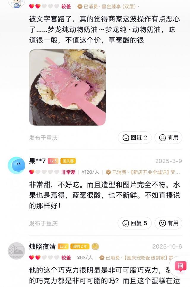收到货后一打开马女士就感觉不对,蛋糕表面的奶油色泽暗沉、边缘结块脱落、上面的水果干瘪发蔫,部分果肉甚至已经发黑。“所谓的‘动物奶油’吃起来甜腻糊嘴,蛋糕胚干涩粗糙,和我平时吃的梦龙有明显的差异。”马女士说。