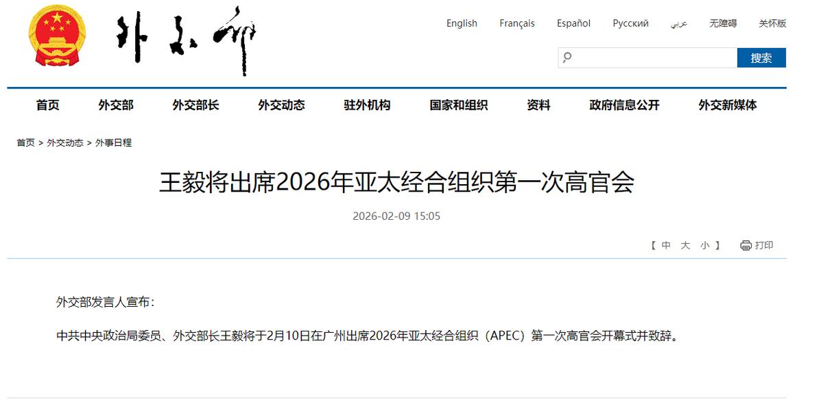 中外交部正式宣布, 2月9日,中国外交部正式发布消息:外交部长王毅将于2月10日在广州出席2026年APEC第一次高官会开幕式并发表致辞,这标志着亚太地区最重要的经济合作平台,正式进入“中国时间”。 很多朋友可能看不懂,这到底是啥事儿?APEC是啥?高官会又是啥?跟咱们普通人有啥关系? 先给大家说两个最基础的词,APEC和高官会。APEC说白了,就是亚太地区各个国家,凑在一起搞经济合作的大圈子。 里面有21个成员,像中国、美国、日本这些国家都在里面,基本涵盖了亚太地区所有有钱有实力的经济体。 这个圈子不争高低,就是大家坐在一起商量,怎么互相做生意、一起赚钱,解决合作中遇到的麻烦。 最后让这个地区的经济越来越好,大家都能沾光,它也是亚太地区最大、最有影响力的经济合作圈子。 再说说高官会,可不是大家想的那样,都是大官聚在一起闲聊。高官会是APEC的核心,每年要开好几次,来的都是各个国家的大使、司长级别的官员,偶尔也有副部长级别的。 他们的活儿很简单,就是把当年APEC要做的大事,拆成一件件能落地的小事,协调好各个国家的意见,解决大家的分歧,为年底各国领导人开会打基础。 简单说,领导人年底定大方向,高官会就是提前把准备工作做好,不然领导人开会也聊不出啥实际成果。 这次在广州开的,就是2026年APEC第一次高官会,从2月1号开到10号,有1400多名外国代表来广州,一起商量今年合作的事儿。 王毅外长去出席开幕式、发言,就是告诉全世界,咱们中国作为今年的东道主,一定会认真负责,带着大家一起把亚太经济搞好。 那啥是“中国时间”呢?很简单,2026一整年,APEC所有的会议、所有的合作安排,都由咱们中国说了算、来安排。 这是咱们中国第三次当东道主了,前两次是2001年和2014年,都办得特别好,为亚太合作帮了大忙,这次时隔12年再当东道主,意义特别大。 可能有人会问,为啥让咱们中国主导?这不是凭空来的,是咱们中国有实力、有担当。 现在世界不太平,很多国家只顾自己,不愿意跟别人合作,导致全球经济不好,亚太地区也很迷茫。 而咱们中国一直敞开国门,自己发展的同时,也带着周边国家一起赚钱,所以国际社会都信任咱们,希望咱们来主导。 大家最关心的,这事儿跟咱们普通人有关系吗?当然有!就说这次广州的会议,1400多名外国代表来,吃住出行都要花钱,能带动广州的酒店、饭店、交通发展,当地老百姓能间接受益。 而且为了迎会议,广州修了路、搞了绿化、装了新灯光,这些都会一直保留,老百姓的生活环境也变好了。 除此之外,以后咱们能买到更便宜的进口商品,就业机会更多,出国旅游、探亲也更方便,身边的小老板也可能有机会跟外国企业合作,赚更多钱。 总的来说,APEC进入“中国时间”,是件值得咱们所有人自豪的事,既体现了咱们中国的实力,也实实在在跟咱们的生活挂钩。 不用懂太多专业词,只要知道,咱们中国正在带头做一件好事,能让国家更强大、咱们的日子更红火,就足够了。
