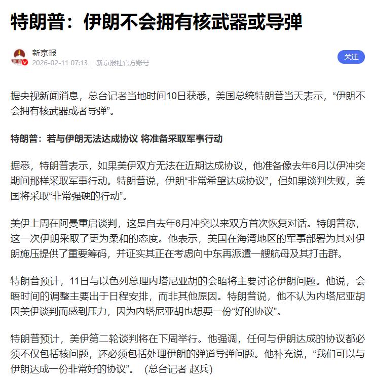 特朗普放狠话:伊朗不能有核武和导弹,谈不拢就动手 根据央视新闻报道,当地时间10号,美国总统特朗普公开说了,伊朗绝对不能有核武器,也不能有导弹。 除此之外,他还放了硬话,要是近期美国和伊朗谈不拢,达不成协议,他就准备像去年6月伊朗和以色列打架的时候那样,对伊朗动手。 特朗普还说,伊朗其实特别想达成协议,但要是谈崩了,美国肯定会来硬的,绝不手软。 首先得说清楚,特朗普说的这话,不是随口吹牛,他有底气说。美国在中东那边,常年放着很多军舰、战机,一直盯着那块地方,这就是他敢放狠话的本钱。 而且最新消息说,特朗普还证实,美国正打算再往中东派一艘航母,目的就是给伊朗施压,让伊朗在谈判的时候不敢硬气。 大家可能好奇,特朗普说的去年6月动手,是真的动手了吗?没错,是真的。去年6月,以色列先动手炸了伊朗,双方打得很凶,而美国当时也直接参与了,还炸了伊朗的核设施,把伊朗的核设施毁得差不多了。 现在特朗普又提这事,就是在警告伊朗,他说到做到,要是谈不拢,去年的事还会再发生。 有人会问,那现在美国和伊朗不是在谈判吗?其实美伊的谈判才刚重新开始,就在上周,双方在阿曼见了面,这是去年6月打完架之后,第一次坐下来谈。 特朗普说,这次伊朗的态度软了不少,确实想达成协议,这话不假,毕竟去年伊朗被打惨了,核设施毁了,再加上美国一直制裁它,伊朗的压力特别大,确实想谈。 但特朗普也说了,要谈可以,协议里必须说清楚两件事:一是伊朗不能搞核武器,二是不能搞导弹,这两件事是美国的底线。 他之所以这么坚持,就是怕伊朗有了核武和导弹,会威胁到美国在中东的利益,也会威胁到美国的盟友以色列。 要知道,以色列一直把伊朗当成最大的敌人,总说伊朗要搞核武器,还多次说要动手打伊朗。 当然,伊朗也不是软柿子,不会随便妥协。伊朗说,自己搞核计划是为了和平使用,不是要造核弹,那些说伊朗要造核弹的话,都是以色列故意造谣,就是想打压伊朗。 而且伊朗虽然想谈判,但也不会接受美国的无理要求,毕竟导弹是用来保护自己的,不可能说放弃就放弃。 现在的情况就是,美国和伊朗都想谈,但想法差得很多。特朗普放狠话,说白了就是想逼伊朗让步,听美国的话,不让伊朗搞核武和导弹。 特朗普说,下周双方还要再谈一次,能不能谈成,现在还不好说。这事看着离我们远,其实和我们也有关系。 要是谈崩了,美国真的再打伊朗,中东就会乱起来,甚至可能引发更大的战争,还会影响全球的能源供应。 不过,看目前这个形势,双方都不会妥协的,因为伊朗知道美国不靠谱,具体谈的如何,后续有消息,我会再跟大家说的。