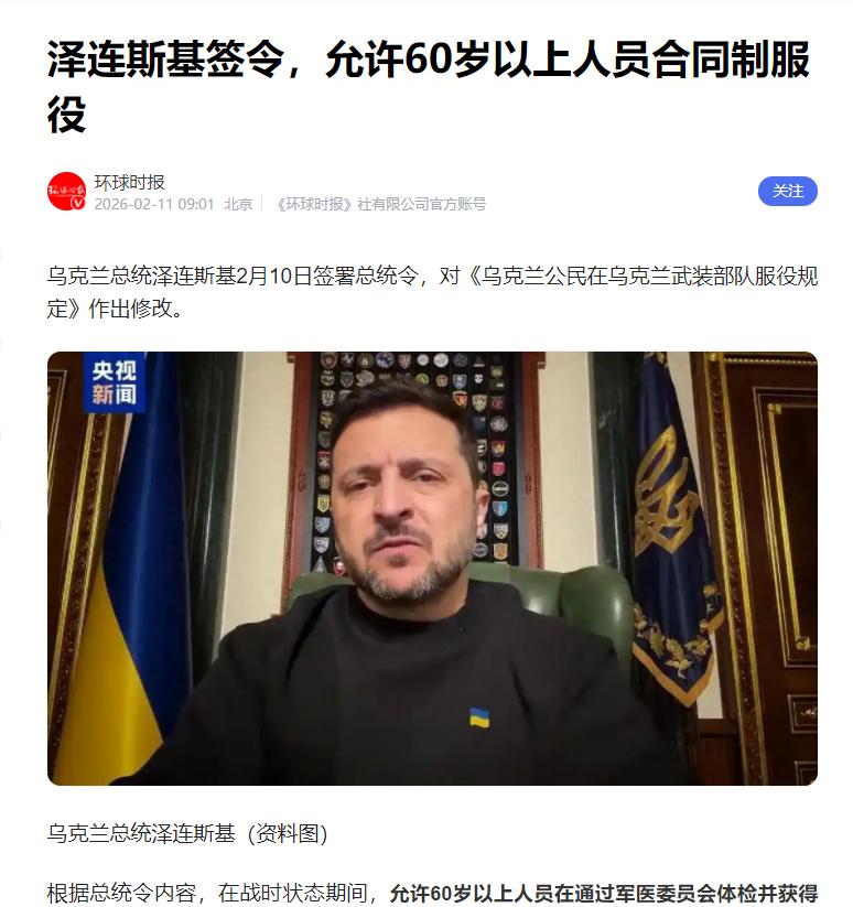 泽连斯基真是够了!60岁以上的老人都被他拉出来当兵了!乌克兰总统泽连斯基2月10日签署总统令,对《乌克兰公民在乌克兰武装部队服役规定》作出修改。 只要乌克兰还在打仗,60岁以上的老人,只要身体通过部队医院检查,再得到部队指挥官同意,就能和部队签合同当兵。 合同期一年,部队需要还能再延长一年,战争停了,合同就提前结束,老人按规矩退休。泽连斯基会这么做,不是一时兴起,背后全是现实考量,具体原因有三个,都很实在。 第一个最核心的原因,就是乌克兰实在没人当兵了。乌克兰已经打了好几年仗,能当兵的年轻人快耗光了,这几年他们的征兵政策一次次收紧,还是不够用。 2022年战争刚爆发,乌克兰就不让18到60岁的男人出国,怕他们跑了没人当兵,一开始只招有当兵经验的人,后来连有专业技能的女人也被召去了。 2024年4月,又把强制征兵的最低年龄从27岁降到25岁,还规定战时当兵的人不能随便退役,甚至征募符合条件的囚犯上前线,即便这样还是不够。 这几年,很多适龄年轻人要么在战场上牺牲、受伤,要么偷偷跑出国躲战争,国内能当兵的年轻人越来越少,泽连斯基没别的办法,只能打老人的主意。 第二个原因,是乌克兰经济太差,很多老人只能靠当兵谋生。乌克兰因为常年打仗,经济早就垮了,老百姓日子不好过,尤其是退休老人,退休金根本不够吃饭、穿衣,维持基本生活都困难。 而泽连斯基已经明确,2026年乌克兰武装部队合同制军人,月薪大概5到6万格里夫纳,差不多相当于人民币8000到9800块钱,在现在的乌克兰,这已经是很高的工资了。 总统令里说老人是“自愿”当兵,但实际上,很多老人都是为了赚这份工资,才愿意签合同,并不是真的想上军营受苦、面对危险,泽连斯基也正是抓住了这一点,才能让老人愿意参军。 第三个原因,是泽连斯基想继续维持战局,必须补充兵员。他一直想靠西方的援助,再加上足够的兵力,继续和俄军对抗,根本不愿意轻易寻求和平。 他心里很清楚,要是兵源断了,战局就撑不下去了,自己的政治诉求也无法实现。而且现在西方援助不稳定,美国、欧洲的支援时断时续,乌克兰只能靠自己内部挖潜。 这些60岁以上的老人,不用被派到前线打仗,大多去做后勤、医疗、维护设施等非战斗工作,刚好能填补部队的岗位空缺,还能把原本做这些工作的年轻人腾出来,送到前线去,这样就能勉强维持战局。 兵员耗尽、经济崩溃、外援不稳,这些现实问题摆在面前,泽连斯基没有选择寻求和平,而是选择榨干国内最后一点人力潜力。 让本该安享晚年的老人,来填补战争的缺口,这一切都是为了他能继续撑下去,根本不是为了乌克兰普通民众的安宁。