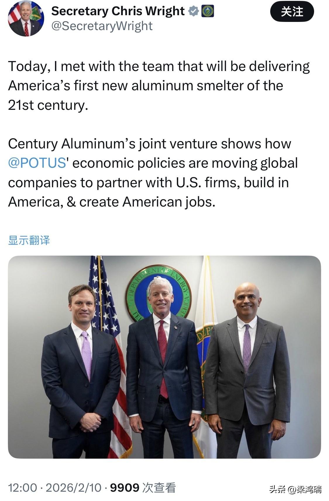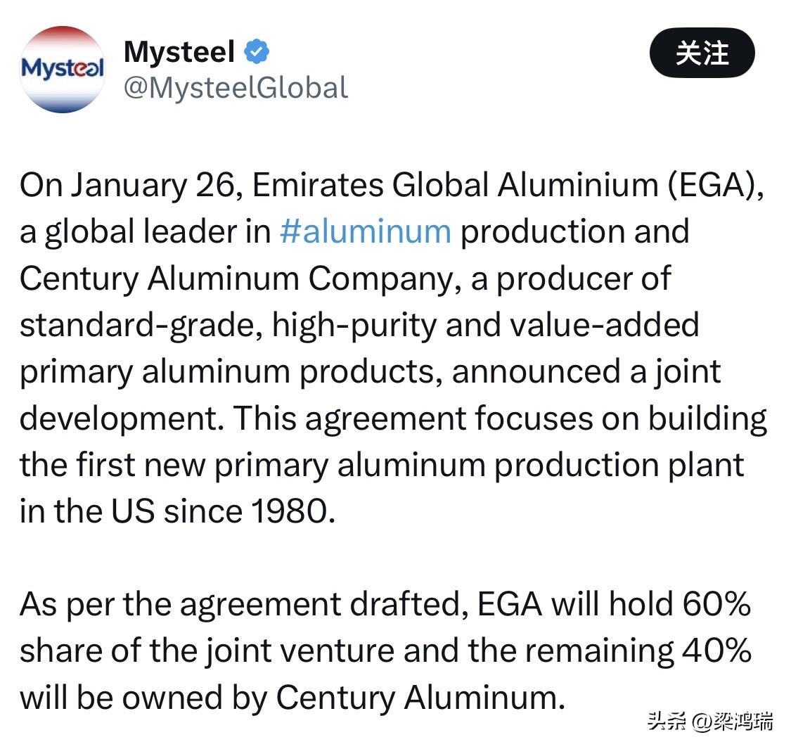 1月26日,全球领先的原铝生产商阿联酋环球铝业公司aluminum EGA)与标准级、高纯度及高附加值原铝产品生产商世纪铝业公司宣布达成一项联合开发协议。该协议旨在建设自1980年以来美国首个新建原铝生产厂。 根据拟定的协议,EGA 将持有合资企业 60% 的股份,剩余 40% 的股份将由 Century Aluminum 持有。 1. 项目核心概况 地点:俄克拉荷马州伊诺拉(Inola, Oklahoma)的Tulsa港工业园区。 合作方:由阿联酋环球铝业(EGA)发起,世纪铝业于2026年1月宣布加入并持有该合资企业40%的股份,EGA持有60%。 产能:预计年产75万吨原铝,较最初规划有所扩大,投产后将使美国现有的原铝产量翻倍以上。 建设规模:总投资预计约40亿美元。工程建设由 Bechtel (必和必拓) 负责前期规划,预计2026年底开工,2030年前投产。 2. 技术与政策背景 “绿色”与高效:该厂被定位为“绿色冶炼厂”,采用EGA的顶级技术,旨在比传统冶炼厂降低约75%的碳排放。 政府支持:该项目获得了美国能源部(DOE)的支持,包括根据《通胀削减法案》等政策提供的最高5亿美元资助。 战略意义:美国目前约85%的铝需求依赖进口。新厂将加强国防、汽车(特别是电动汽车)和航空航天领域的供应链弹性。 3. 公司动态与财务状况 世纪铝业(CENX)在宣布该合作协议后股价表现强劲。此外,公司近期完成了资产剥离,于2026年2月将其位于肯塔基州的闲置Hawesville工厂出售给 TeraWulf,用于改造为人工智能及高性能计算的数据中心园区。