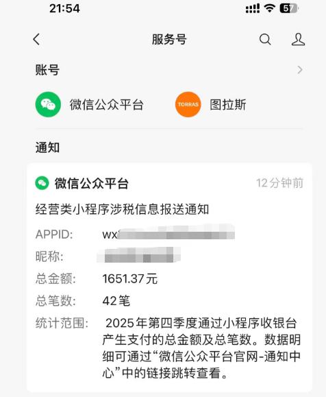 最近好多做经营类小程序的朋友都收到了涉税信息报送通知,一看就慌了,生怕出问题!其实真没必要焦虑,这只是国家税务总局的政策正式落地,微信平台按要求统一推送的通知而已。 只要你的小程序有交易入账,基本都会收到,给大家说清两种情况怎么处理:企业主体的小程序,要是用的微信官方支付,没对接第三方支付,完全不用管,款项走对公正常报税就行;个体工商户的话要多留意,各地政策有差异,建议咨询专业财税人士。 目前只是信息报送阶段,但长远来看,小程序收入纳入正规申报体系是必然趋势,重视但不用慌,按规来就没问题! 小程序涉税 经营类小程序 小程序报税