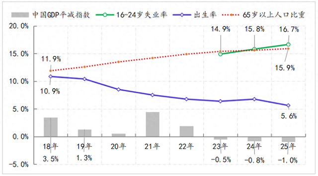 除了上述短期逆周期政策取向的约束之外,中期经济运行对人民币利率与汇率趋势性变化的影响更为根本,在政策层面则体现为跨周期的考虑。对于中国经济运行的中期变化,我们始终最为看重人口因素,即下图。至2025年,疫后复苏已整整三年,期间在多轮增量政策推动下,经济复苏进程持续至今,但人口因素的影响还在集中显现。因此,从中期的视角,宽松的货币金融条件距离根本性逆转还需要时间。