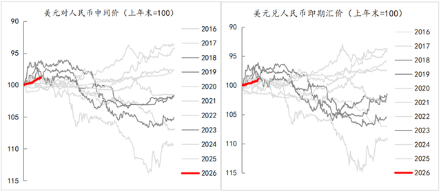 与利率锚定内部因素有所差别,因为外部货币环境始终会影响汇率,因此,汇率的锚不太好辨识。市场更多基于经验来判断,例如,过去十年间,强势开局的人民币汇率,多数以弱势收尾,如2018年、2019年和2023年。如果考虑到利率中枢下行的判断,似乎也不支持汇率能够持续强势。