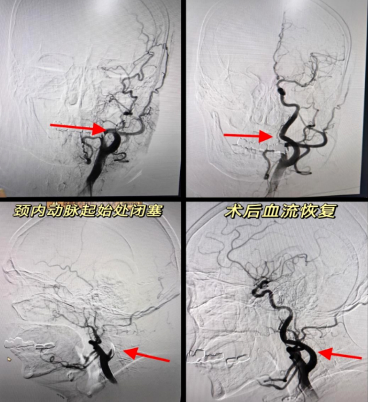 据了解,3个月前在漯河出差的张先生突然出现意识不清、右侧肢体瘫痪,伴有小便失禁,烦躁明显,陪同人员立即拨打120将其送至漯河市中心医院急诊科。神经内科黄圣明主任医师认真为患者查体,进行神经功能评估,准确判断患者脑大血管闭塞,静脉溶栓后患者病情无明显改善,患者符合急诊取栓指征,在与家属充分沟通后,介入手术团队争分夺秒奔赴手术室。急诊造影显示左侧颈内动脉闭塞,急诊行机械取栓术,将取栓器械精准送达阻塞部位。当血管再通的那一刻,监测仪器上的脑血流信号瞬间恢复,患者颈内动脉再通,为濒危的脑组织注入了“生机”。第二天患者意识已经有所恢复,在严格规范按照指南药物治疗疾病的同时,加强患者心理疏导,消除对疾病的恐惧。