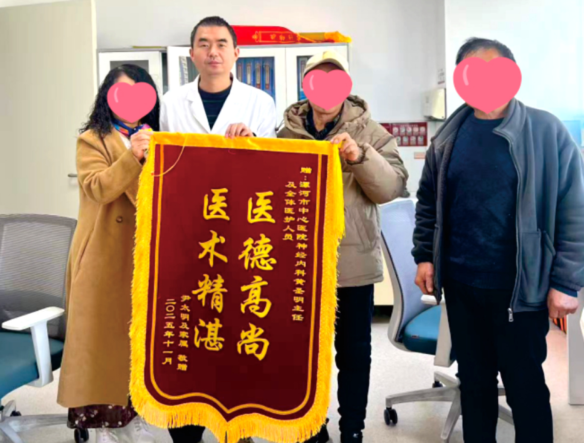 近日,家住郑州已出院3个多月的张先生及家属一行3人从郑州专程来漯河,将一面印有“医德高尚医术精湛”的锦旗,送到漯河市中心医院神经内科二病区黄圣明主任医师的手中。
