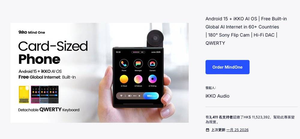 他们这款名为MindOne的“AI手机”在2025年中发布概念时,在kickstarter上完成了超1000万元的认购,并截止今日(2月5日)取得了5000万元的预售成绩(3000万元toC、2000万元toB)。这金额在手机行业当然算不上一笔大金额,但在新品牌几乎绝迹的时代,它却足够吸引眼球,它似乎证明了,仍有人愿意为另一种手机想象买单。
