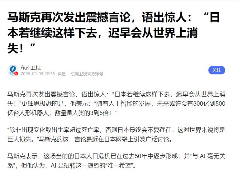 据媒体2月9日报道,马斯克曾经发出震撼言论,语出惊人:“日本若继续这样下去,迟早