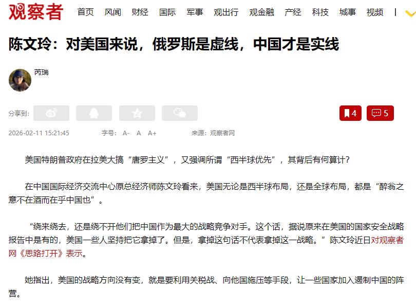 美国心里门儿清:俄罗斯是虚的,中国才是真正要防的 很多朋友可能听说了,美国最近在美洲那边总搞小动作,一会儿逼这个国家听话,一会儿拉那个国家站队。其实大家别看它闹得欢,它真正要针对的不是俄罗斯,是咱们中国。 专家陈文玲说得很明白,美国总把中国和俄罗斯放在一起提防,但对美国来说,俄罗斯就是个“虚的”,咱们中国才是“实的”。 先说说为啥俄罗斯是虚的。这几年俄乌一直在打仗,俄罗斯所有精力都放在欧洲那边了,一边要应对战争,一边要顾着国内老百姓的日子,根本没心思管美洲的事。 美洲离俄罗斯本来就远,它现在自顾不暇,既没钱也没精力在那边投资、做生意,更谈不上扩大影响力。 所以对美国来说,俄罗斯看着像个对手,其实在美洲根本威胁不到它,就是个摆设,美国只是故意把它和中国绑在一起,找个针对中国的借口。 说完俄罗斯,再说说咱们中国为啥是实的。这可不是瞎吹,全是实打实的事。陈文玲也说了,美洲的拉美地区,是咱们中国重要的投资地,咱们和拉美国家的生意往来特别密切。 按区域算,咱们对拉美的投资,只比对东盟的少,排第二。这些钱都用在了正经地方,比如帮他们修公路、建港口、搞农业,都是和当地老百姓生活、国家发展有关的事。 咱们和拉美国家的贸易也特别多,巴西的大豆、阿根廷的牛肉、智利的铜矿,很多都卖到中国,走进了咱们家里;咱们中国的家电、手机、生活用品,也大量卖到拉美,当地老百姓都很喜欢。 时间长了,咱们和他们就绑在了一起,谁也离不开谁。而且咱们中国合作从不欺负人,不像美国那样耍霸权、抢好处,所以拉美国家都愿意和咱们打交道,咱们在那边的口碑、影响力都特别好,这就是美国最害怕的地方。 美国这么针对咱们,说白了就是眼红又害怕。它一直把美洲当成自己的地盘,觉得只能它说了算,见咱们和拉美合作越来越近,就坐不住了,想把咱们从美洲挤出去,切断咱们的投资、生意,甚至毁掉咱们在那边的好名声。 这几年它也确实这么做,逼拉美国家在中美之间选边站,还造谣说咱们的投资是陷阱,故意挑拨关系。 可美国的算盘打错了。咱们和拉美国家合作,对双方都有好处,他们需要咱们的投资和帮助,咱们也需要他们的资源和市场。 拉美国家也不傻,知道和中国合作能得到实实在在的好处,美国只是想利用他们,根本不会真心帮他们发展。 比如2025年,阿根廷和咱们的贸易额涨了56%,和美国只涨了18%,明眼人都能看出谁才是真心合作。 可能有人会问,美国这么闹,对咱们有影响吗?肯定有一点,会给咱们和拉美合作添点麻烦,但咱们不用怕。咱们的合作是真心实意的,不是美国靠造谣、施压就能切断的。 咱们中国发展的势头挡不住,不管美国怎么闹,咱们都会继续和拉美国家好好合作,一起发展。