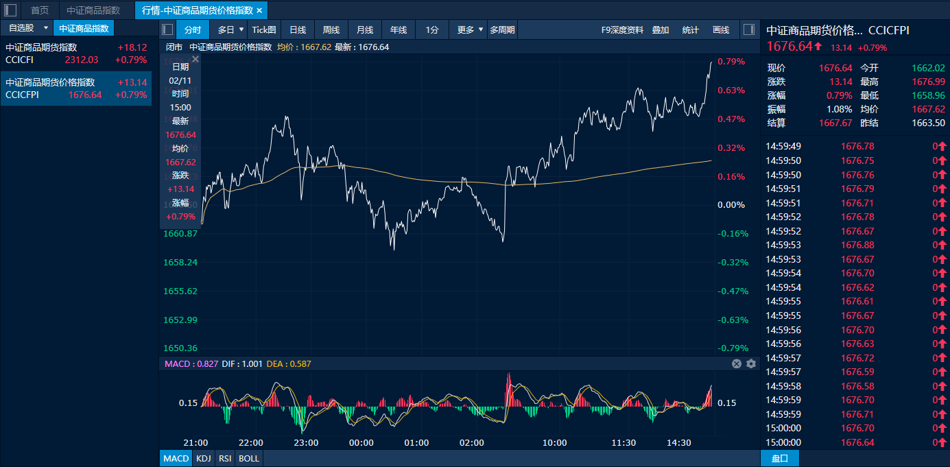 截至11日下午收盘,中证商品期货价格指数收报1676.64点,较前一交易日上涨13.14点,涨幅0.79%;中证商品期货指数收报2312.03点,较前一交易日上涨18.12点,涨幅0.79%。