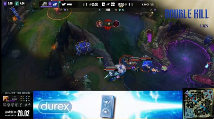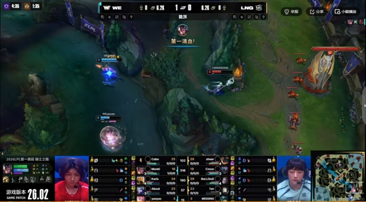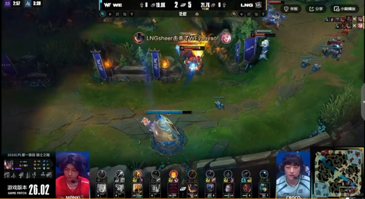 [21:55]WE中路强开,一直追到了对手中一塔下强杀BuLLDoG发条魔灵,但是正面LNG下路组先秒yaoyao萨勒芬妮,sheer兰博回援堵位置+补伤害,Croco贾克斯还绕后切死了About艾希!这波LNG团灭WE,顺势拿下大龙!7K经济差了!