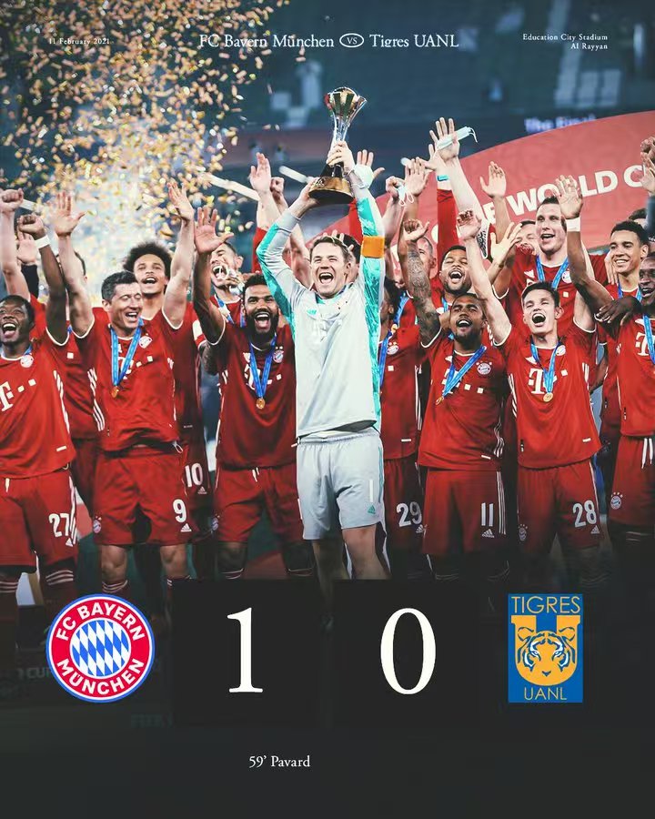 虎扑02月11日讯五年前的今天,在2021年世俱杯决赛中,拜仁慕尼黑以1-0击败墨西哥球队老虎大学,捧起了世俱杯冠军奖杯,从而完成了六冠王伟业。
