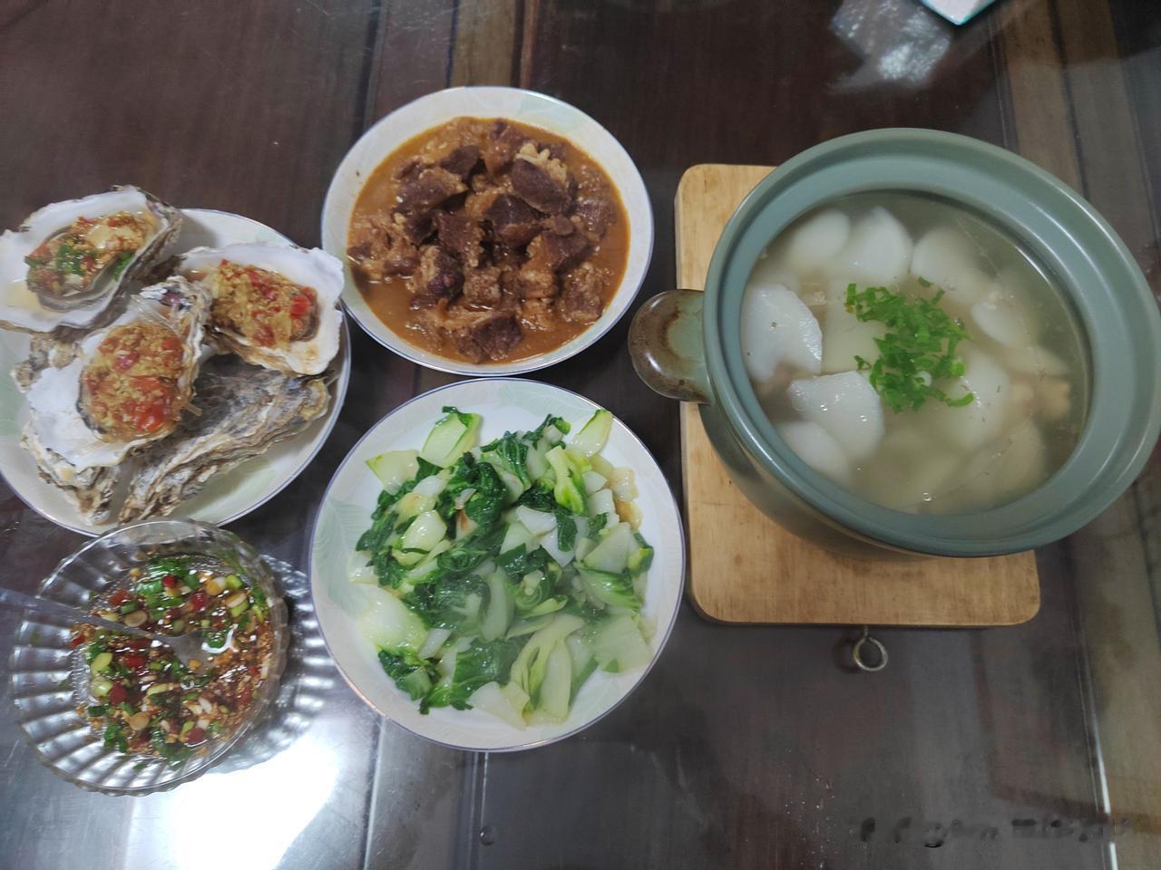 今天腊月二十四,南京市天气放晴,阳光在线,白天最高温度14℃。阳光灿烂,暖意融融,正是节前洗晒的好日子。 早上五点多钟开始洗床单被套,由于冬天的床单被套比较厚,两个房间的床单被套分四次洗的。洗好的床单被套拿到八楼楼顶晾晒,今天天气晴好,楼顶晾晒得满满当当的。 早饭吃蒸包子、白鸡蛋和年糕稀饭,包子是昨天在社区买的豆腐皮包,菜是昨天晚上剩的芹菜炒黄牛肉。 中午吃一锅炖,昨天晚上吃炖鱼,番茄底锅,加了粉丝、豆干、牛肉丸在里面,昨天晚上没吃完,还剩一大半。今天中午加点豆芽和青菜在里面,蒸个米饭,中饭就解决了。 下午去超市逛一逛,买了牛肉、牛骨、猪肉、虾子、带鱼、生蚝、鸡蛋、皮蛋、咸鸭蛋等,还买了苹果、沃柑和阜宁大糕。 晚上蒸生蚝、红烧牛肉、炒青菜、牛骨炖萝卜汤。 年离我们越来越近了,年味也越来越浓了!