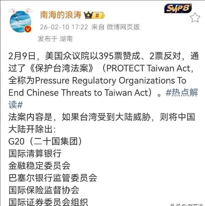 美国众议院以高得票率,通过了《保护台湾法案》,如此重要的法案通过,国内新闻居然没有多少相关报道,还是通过大咖的自媒体得知,本以为美国要武力干涉台海问题,真是让人想不到他们是这样制裁我们的:开除二十国集团,开除金融稳定委员会,开除…,就是把我们从美国主导国际经济组织组织中赶出来。 这法案从头到尾的核心,就是绕开直接冲突,用经济领域的软刀子下手。 毕竟真要动武,美国自己也扛不住代价,军费开支、地缘风险都是无底洞,反而不如在国际经济组织里做文章,既隐蔽又能精准打击,还能给自己留后路。 这些美国主导的国际经济组织,说穿了就是他们说了算的圈子。二十国集团、金融稳定委员会这些名字听着高大上,本质上都是美国维护自身利益的工具。 他们所谓的“开除”,不是真的发个通知把人赶出去,而是通过修改规则、设置门槛、抱团孤立的方式,让中国在这些组织里说话没分量、参与受限制。 比如在金融稳定委员会里,美国会联合盟友阻挠中国参与关键规则制定,在二十国集团的相关经济议题里,刻意排除中国核心关切,慢慢把中国边缘化,制造一种“被赶出圈子”的既成事实。 这么做的门道很简单,美国知道中国现在是全球经济的重要玩家,脱离这些组织会增加发展成本。但他们又不敢真的完全割裂,因为中国市场和产业链对美国太重要了。 所以就搞出这套表面制裁、背后赚钱的戏码。一边在国际上喊着要把中国从经济组织里踢出去,给盟友们看,证明自己对“小弟”够意思,巩固所谓的同盟体系。 另一边却绝不放弃中国这块肥肉,任由本国企业继续来华做生意,赚得盆满钵满。 这种双重操作早有先例。美国政府嘴上喊着对华制裁,限制这个限制那个,但美国企业的脚步从没停下。 数据显示,大部分在华美国企业都在盈利,不少还在持续增加投资。医疗健康、制造业、零售业这些领域,美企的参与度一点没减。 他们心里门儿清,放弃中国市场就是跟钱过不去,政府的政治操作为了选票和盟友,企业的经营要的是真金白银,两边各玩各的,互不耽误。 美国这么折腾,核心就是想两头占便宜。一方面,通过在国际经济组织里打压中国,遏制中国的发展势头,维护自己的霸权地位。 这些组织掌握着全球经济规则的制定权,把中国排挤出去,就能继续让规则围着自己转,不让中国有机会挑战他们的主导地位。 另一方面,又舍不得中国的庞大市场和完整产业链,偷偷保持贸易往来,赚足利润。 这种操作既安抚了国内的强硬派,又给盟友们做了示范,让小弟们觉得美国真的在“出头”,同时自己还没蒙受经济损失,简直是一本万利的算计。 更关键的是,这种手段比军事干涉安全多了。军事对抗风险太高,一旦擦枪走火,后果不堪设想。 经济领域的排挤则隐蔽得多,表面上是“规则内的操作”,打着维护所谓“国际秩序”的旗号,不容易引发直接冲突。 而且这种制裁方式成本低、见效快,能精准打击中国的外部发展环境,还能让美国把自己包装成“受害者”或者“规则维护者”,混淆视听。 美国的小弟们看着美国在国际经济组织里对中国动手,自然觉得大哥够意思,在为他们撑腰。这些小弟大多依赖美国的市场和安全保护,美国的这种操作能巩固同盟关系,让他们更愿意跟着美国走。 但这些小弟不知道,或者假装不知道,美国在给他们做样子的同时,自己正偷偷跟中国做生意赚钱。等小弟们真的跟着美国制裁中国,蒙受经济损失时,美国却早已赚得盆满钵满,全身而退。 这种两面三刀的操作,正是美国一贯的行事风格。嘴上喊着公平正义,心里全是利益算计。他们主导的国际经济组织,从来不是为了全球共同发展,而是为了维护自己的霸权。 把中国赶出去,就是为了消除潜在威胁,继续垄断规则制定权。但他们又不敢彻底切断与中国的经济联系,因为中国的市场、产业链和消费能力,是美国企业无法替代的。 所以看似矛盾的操作,其实逻辑很清晰。政治上,通过法案和经济排挤,展示对盟友的“承诺”,打压中国的国际空间。 经济上,放任企业与中国合作,保住自己的利益。这种两头通吃的玩法,既达到了遏制中国的目的,又赚足了钱,还巩固了同盟体系。 说到底,美国所谓的《保护台湾法案》,根本不是为了“保护台湾”,而是借台湾问题为借口,在经济领域对中国下手。 把中国从美国主导的国际经济组织里赶出去,只是他们遏制中国的手段之一。而偷偷跟中国做生意,则是为了保住自己的经济利益。 这种既想当婊子又想立牌坊的操作,把美国的自私和霸权本性暴露得淋漓尽致。 美国的算盘打得很精,但现实往往不会顺着他们的意思走,这种两面三刀的操作,最终只会搬起石头砸自己的脚。