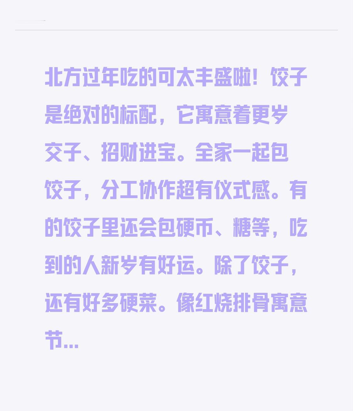 北方过年吃的可太丰盛啦!饺子是绝对的标配,它寓意着更岁交子、招财进宝。全家一起包饺子,分工协作超有仪式感。有的饺子里还会包硬币、糖等,吃到的人新岁有好运。 除了饺子,还有好多硬菜。像红烧排骨寓意节节高升,做法是排骨焯水后用冰糖炒色再炖煮;可乐鸡翅孩子超爱吃,象征展翅高飞;葱爆羊肉喜气洋洋,嫩而不膻。素菜也不少,清炒西兰花寓意花开富贵,醋溜土豆丝顺顺利利。这些菜家家都容易做,过年吃着特香!