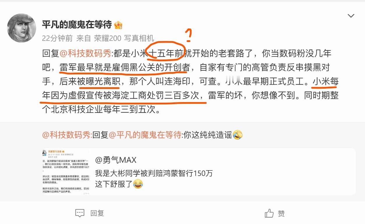 我是大彬同学被判赔鸿蒙智行150万鸿蒙智行起诉我是大彬同学一审判决 网络评论千万不能瞎扯,尤其是V越大承担的责任也就越大,素人号官方一般不追究,但你也不要造谣啊,虽然我有时候看不惯某米的宣传,但我家里有几十台米家设备,虽然有时候我也看不惯某为的宣传,但我也开着某界的车。对事不对产品,只要产品好,我用着舒服就行了。至于对某米和某为的评论,千万不要过于极端,否则你就从米粉、花粉变成了人们口中的米糇mih0u、海狗hi90,这两类人习惯手法都是搜集对方车的事故,玛德,真是有大病,很多这种人动不动就在评论区贴一堆车事故的照片集合,小米和问界的互相都有,不纯纯闲的么?还有刚才这位网友,说话你可注点意吧,啥玩意就小米15年前的老套路了,还黑公关开创者,你是真敢说啊,另外人家连海印也没有离职,别特么瞎扯淡了,还我当数码粉没几年,我可是小米第一代手机30万排队大军里的一员啊,当时3个账号买了3台,雷总在2021年816的时候全部以感恩红包的形式原价返回了,你说我当数码粉没几年?给你个泰罗之光~