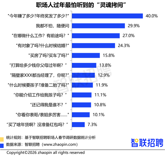 春节社交场合里,亲戚们的“灵魂拷问”是广大职场人躲不开的“劫”。各种“关心式拷问”中,40%的职场人直指“今年赚了多少?年终奖发了多少?”,成为头号“雷区”;紧随其后的是“在哪工作?做什么的?有前途吗?”;24.3%的人则对婚恋问题感到恐慌,“有对象了吗?什么时候结婚?”的质问如五雷轰顶。此外,买房买车、攀比式问候、“给父母多少过年钱”等道德绑架式提问也让不少职场人心生忌惮。不过,也有29.9%的职场人表示“随便问,无所畏惧”,展现出从容心态。