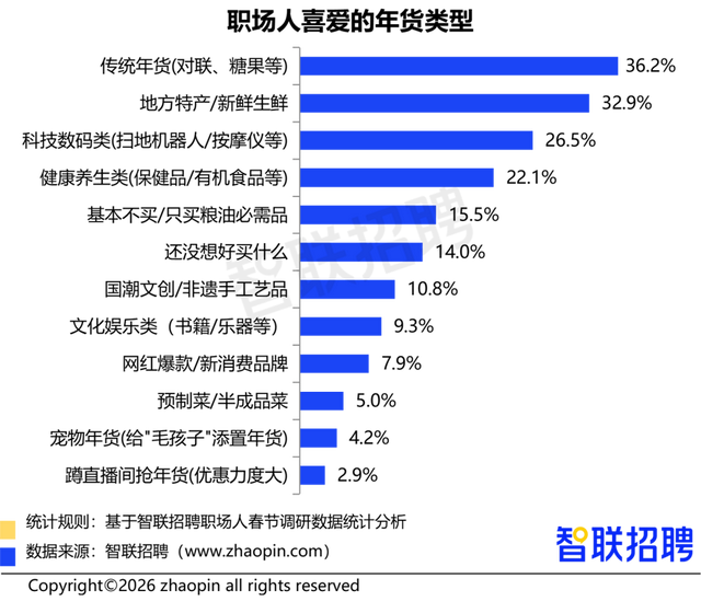 在年货选择上,36.2%的职场人将传统年货(对联、福字、糖果等)列为首选,凸显对传统文化的认同与坚守,贴福字、备年货的仪式感,仍是打工人心中“过年该有的样子”。同时,32.9%的人倾向选择地方特产、新鲜生鲜,年夜饭品质、地道美食受到越来越多人的追捧;另有26.5%的人会选购科技数码类产品(如智能手表、按摩仪等),既可为长辈送上贴心关怀,也能犒劳自己。