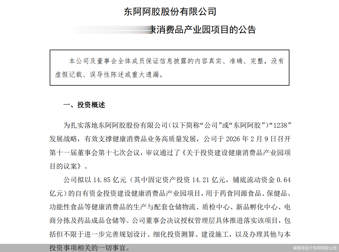 具体来看,2月11日,东阿阿胶发布公告称,公司拟以14.85亿元(其中固定资产投资14.21亿元,铺底流动资金0.64亿元)的自有资金投资建设健康消费品产业园项目,用于药食同源食品、保健品、功能性食品等健康消费品的生产与配套仓储物流、质检中心、新品孵化中心、电商分拣及药品成品仓储等。