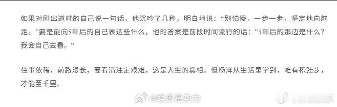 杨洋 也许败了更是一次积累杨洋没有规定自己演什么题材 无论古装奇幻、还是军旅正剧,挑选的角色多少有些共性,但他说没有明确给自己规定,要演什么类型、什么题材。只要角色足够立体、足够丰富,是鲜活的,有精神层面的力量,他都想尝试。他觉得自己每天都在积累,遇见不同的人,做的每一件事,进行的每一次沟通,都有正向的助益:“别太计较成与败,也许败了,更是一次积累。”
