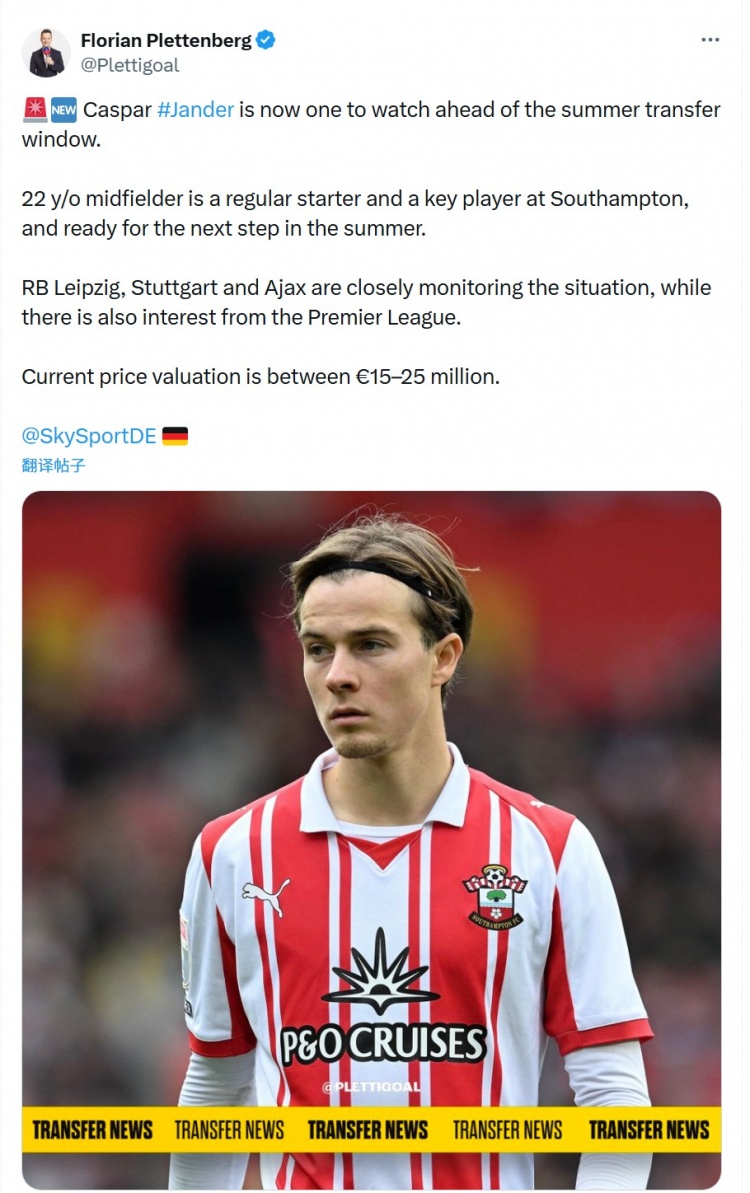 普莱滕伯格指出,卡斯帕·詹德今夏的动向值得关注,他是南安普顿的常规首发和关键球员,已准备好在今夏迈出下一步。
