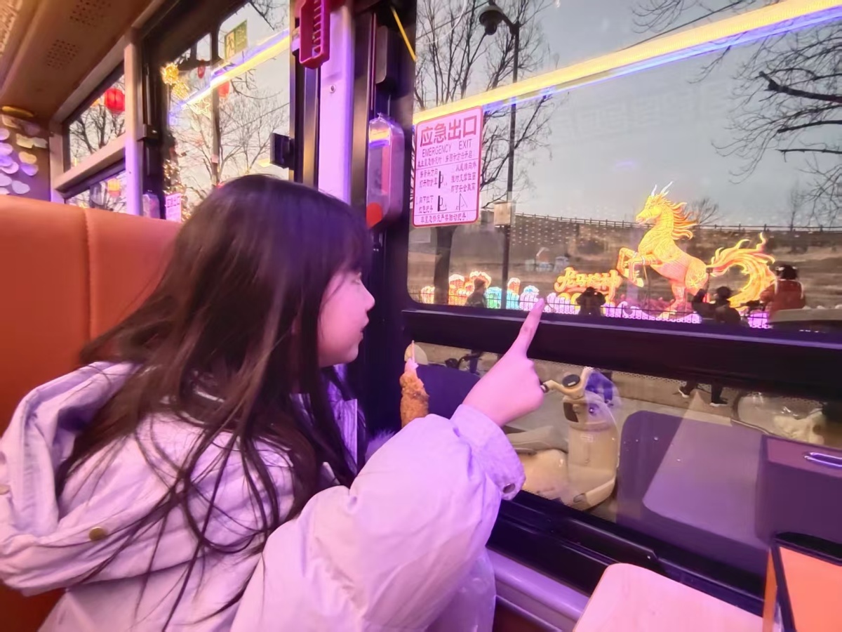 乘坐“商都号”赏灯,还能体验别具一格的“移动观灯”。车辆沿城南路平稳行驶,沿街马年主题灯组次第映入眼帘,灯光透过车窗洒入车厢,与车内新春装饰交相辉映,千年商城遗址的厚重与新春灯彩的灵动完美交融。讲解员同步讲述灯组背后的文化故事与马年民俗内涵,让乘客无需下车,便可在流动风景中沉浸式感受“灯火里的郑州”。