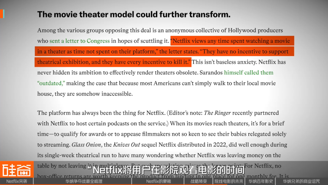 收购官宣的前一天,一群匿名电影制片人致信国会,信中写道:“Netflix将用户在影院观看电影的时间视为未在其平台上花费的时间,他们没有动力支持院线放映,反而有充分的动机扼杀它。”