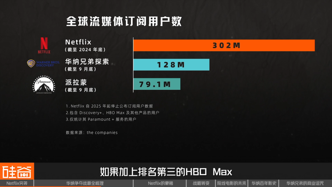 首先,最主要的担心在于流媒体市场的集中度。截至2024年底,Netflix在全球拥有约3亿订阅用户,是流媒体行业的绝对领导者,如果加上排名第三的HBOMax的约1亿订阅用户,合并实体将控制近4亿用户的观看数据和消费习惯。这样庞大的规模,是否代表着Netflix占据支配地位?