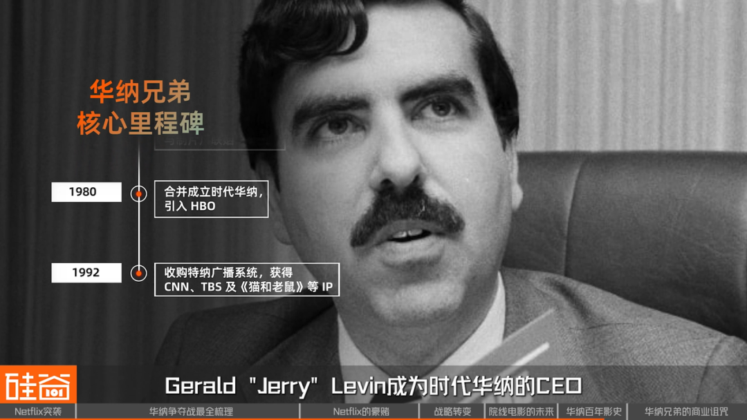 1992年,收购了华纳的SteveRoss去世,Gerald"Jerry"Levin成为时代华纳的CEO。在Levin手上,时代华纳收购了特纳广播电视系统,这笔交易为他们带来了CNN、TNT、TBS等有线电视网,也带来了《猫和老鼠》、《飞天小女警》经典的动画IP。