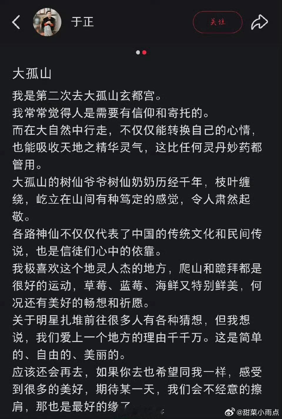 于正回应明星去大孤山玄都宫的原因称人需要有信仰和寄托,而大孤山地灵人杰,有美好的畅想和祈愿