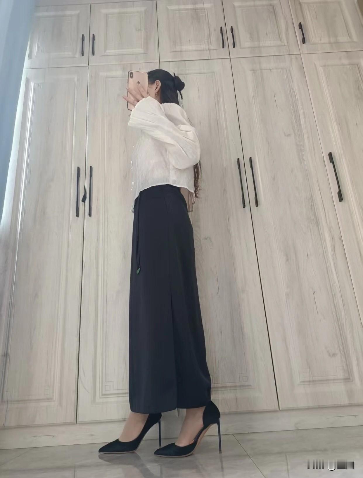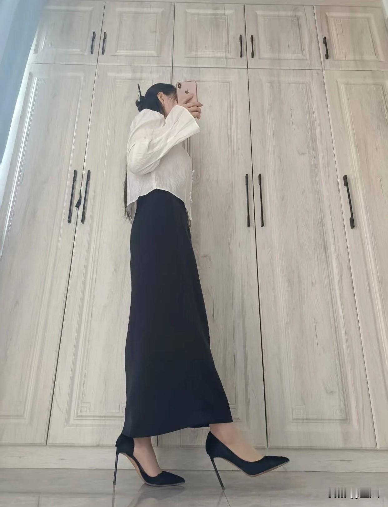 黑色长裙有收缩视觉的效果,选高腰线的款式,把衬衫塞进腰线,能拉长身形,勾勒完美曲
