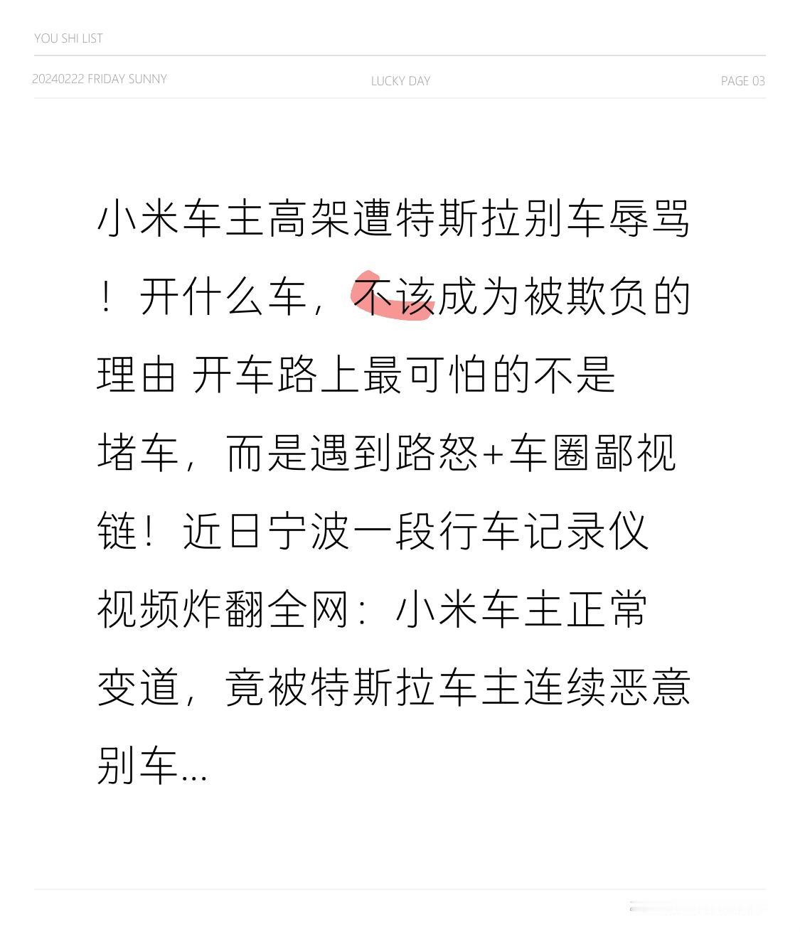 小米车主高架遭特斯拉别车辱骂!开什么车,不该成为被欺负的理由 开车路上最可怕的不是堵车,而是遇到路怒+车圈鄙视链!近日宁波一段行车记录仪视频炸翻全网:小米车主正常变道,竟被特斯拉车主连续恶意别车、逼停、当众辱骂,车上还有老人,吓得脸色发白! 事发高架上,小米车主打灯合规变道,因右侧有慢车未能及时让行,后方特斯拉司机瞬间暴怒。连续多次猛打方向别车、突然急刹堵路,把小米车逼停在高架中央。更过分的是,他下车拍着引擎盖疯狂辱骂:“办贷款买小米装法拉利”“掏空家底买破车”,言语不堪入耳。 小米车主全程克制,没有回骂、没有斗气,只默默保存记录仪证据,为了车上母亲安全,先驶离现场再报警。很多网友看完气炸:凭什么开不同品牌的车,就要被羞辱?凭什么在公共道路上,能随意拿别人生命安全撒气? 本以为只是车主间的小摩擦,没想到背后是刺眼的车圈鄙视链。有人觉得开贵点的车就高人一等,对国产新车冷嘲热讽,把马路当成炫耀优越感的地方,拿危险驾驶发泄情绪,完全不顾及公共安全与他人感受。 事件后续大快人心!警方介入后,特斯拉司机因危险驾驶被记9分、罚款100元,写下书面道歉信,专门给车主母亲打电话致歉,态度诚恳获得谅解。小米法务部也公开发声,坚决支持用户合法维权,抵制路怒与恶意侮辱,全网点赞! 这件事给所有车主敲醒警钟:马路不是竞技场,车牌更不是身份标签。不管开小米、特斯拉,还是几万块的代步车,大家都是平等的交通参与者。别车、斗气、辱骂,轻则扣分罚款,重则引发事故、触犯法律,害人害己。 遇到路怒别冲动,不斗气、不还击,保留证据、及时报警,才是最聪明的做法。尊重别人,就是保护自己;文明行车,才是回家最近的路。 拒绝路怒、摒弃鄙视链,让每一次出行都平平安安。你在路上遇到过路怒吗?评论区说说你的经历,提醒更多人安全驾驶!