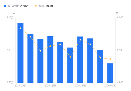日期A股户数(户)流通A股户均持股数(股)户均持股市值(万元)2026-01-30267823157.6815.722026-01-20279923021.1915.152026-01-09290832907.8515.532025-12-31292652889.7715.772025-12-19282412994.5515.072025-12-10287642940.1015.702025-11-28292852887.7915.312025-11-20290252913.6615.112025-11-10294782868.8915.862025-10-31305092771.9415.91