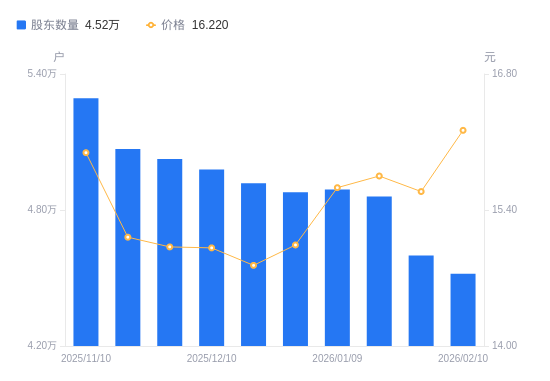 近一年(2025年2月28日至2026年2月10日),电光科技A股股东户数从5.71万户,减低至4.52万户,降幅20.91%,区间股价下跌13.77%。