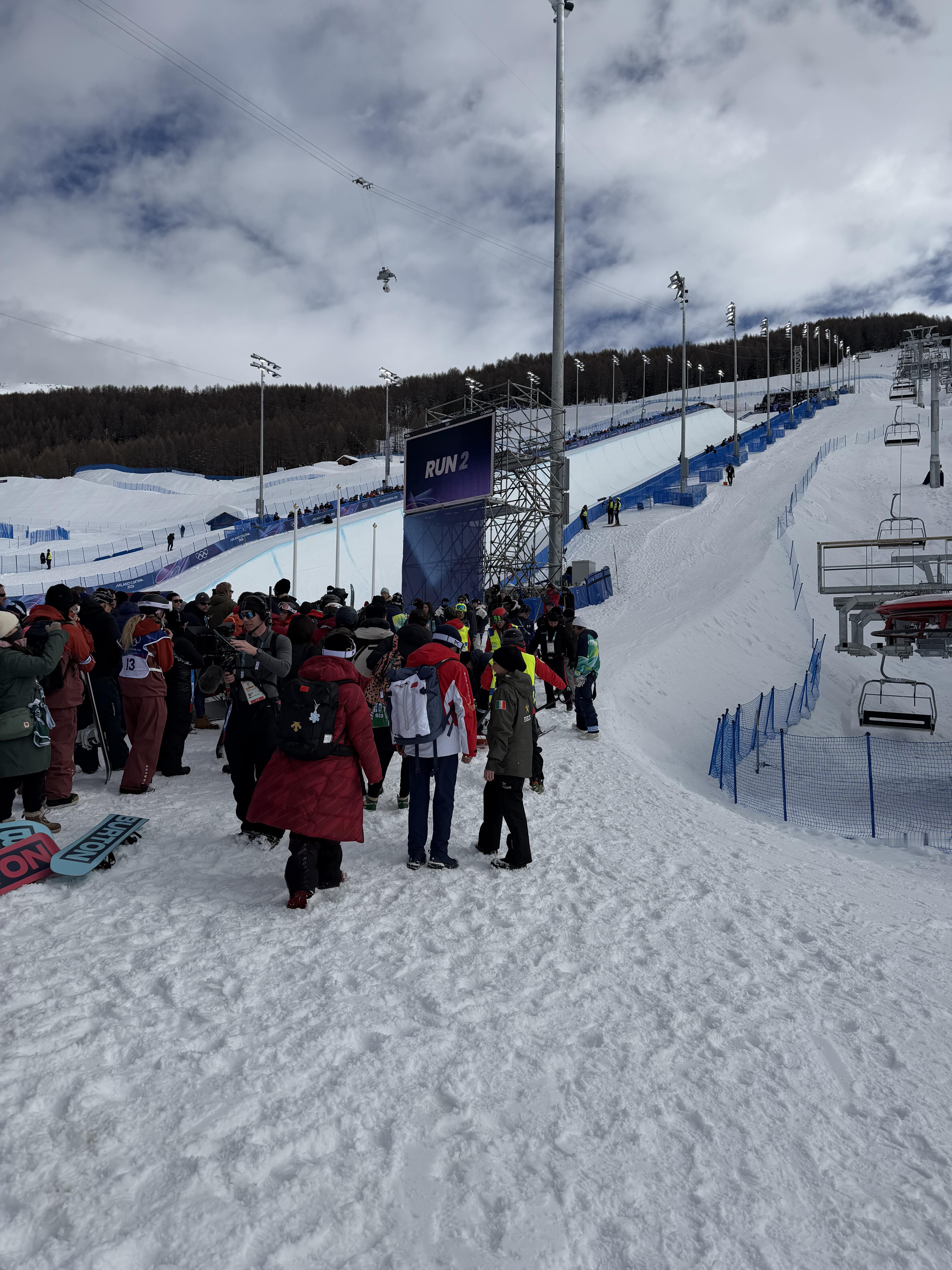 刘佳宇摔倒米兰冬奥现场十分惊险,刘佳宇在最后一个起跳点失去控制,头冲前摔向雪面