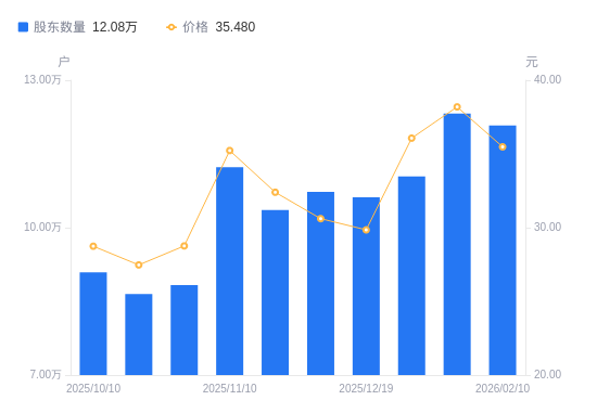 日期A股户数(户)流通A股户均持股数(股)户均持股市值(万元)2026-01-3012320014797.0056.512026-01-2011040016512.6059.562025-12-1910620017165.6451.242025-12-1010730016989.6652.012025-11-2010360017596.4457.012025-11-1011230016233.2257.192025-10-318830020645.4259.382025-10-208650021075.0457.892025-10-109090020054.9057.642025-09-308969120325.2454.47