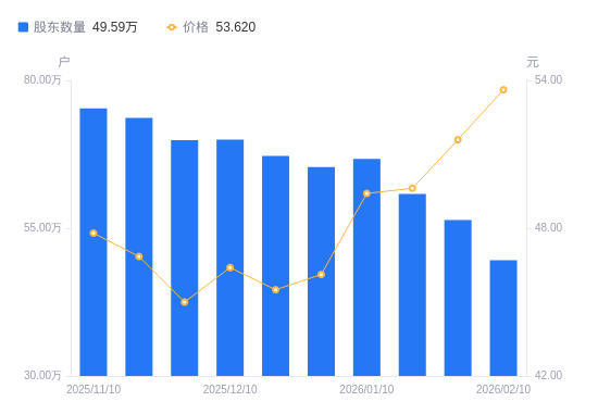 日期A股户数(户)流通A股户均持股数(股)户均持股市值(万元)2026-02-104959357289.3939.092026-01-305639376410.4133.072026-01-206081195944.6729.502026-01-106671575418.6126.772025-12-316533245533.3425.522025-12-196721705378.2024.472025-12-106999115165.0423.972025-11-306989005172.5123.282025-11-207364504908.7723.002025-11-107525004804.0722.96
