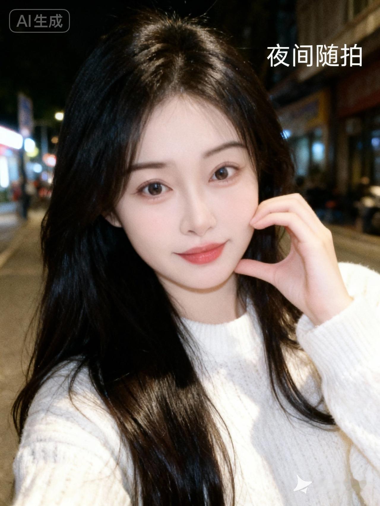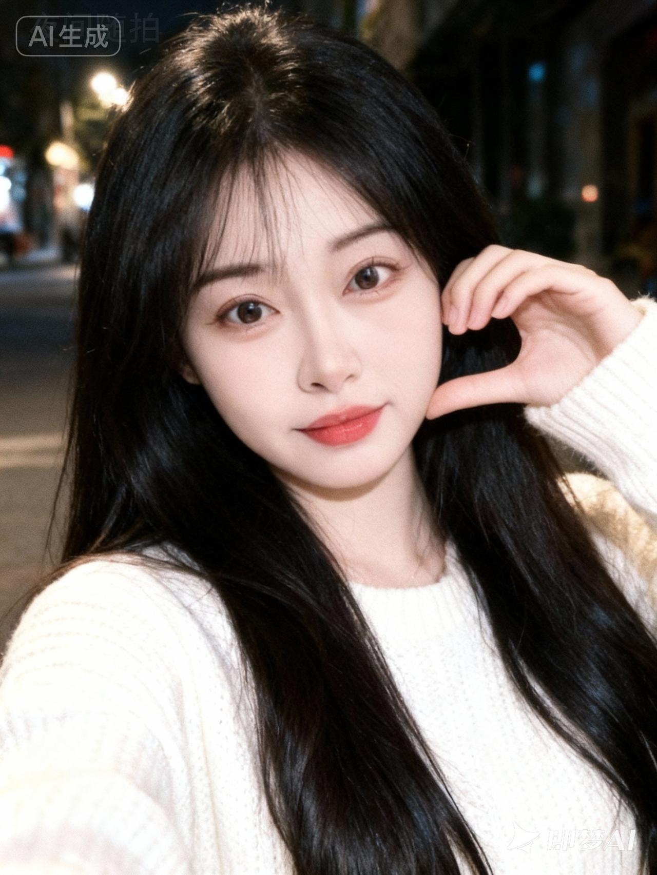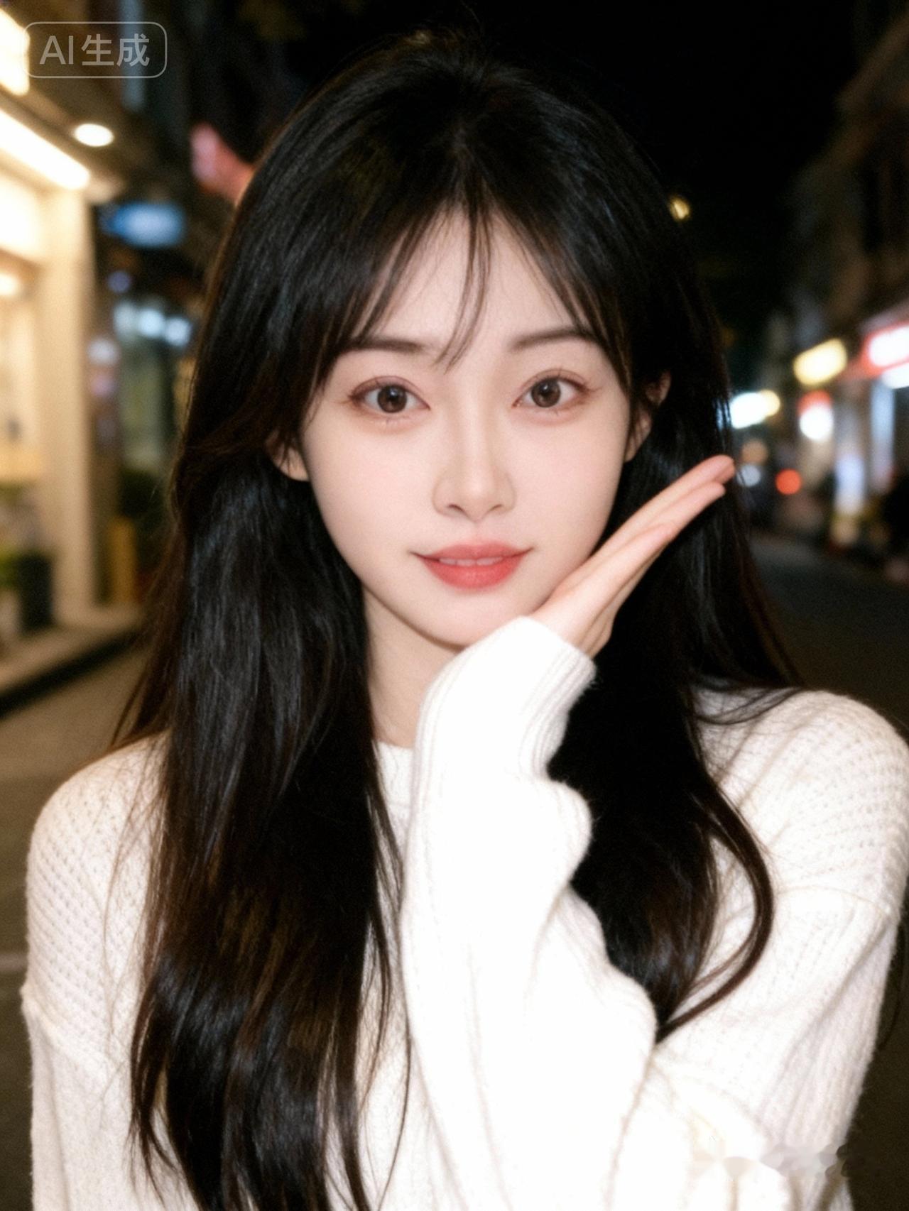 19岁网红女,冷白皮。穿着白色毛织衫,露出长发,发丝柔顺有光泽