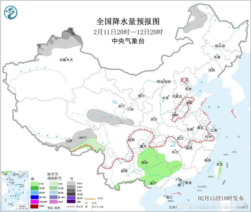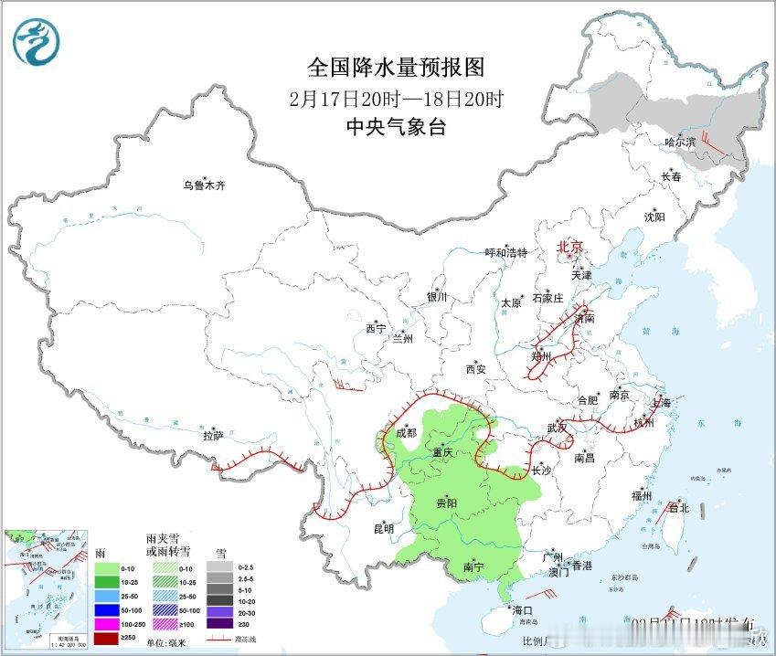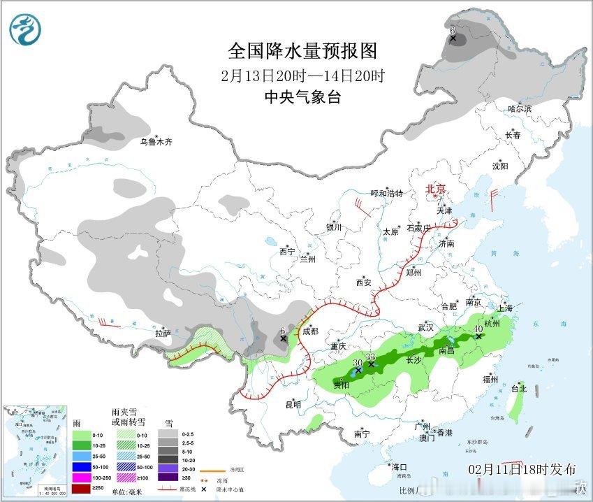 而且13-15日期间,重庆贵州广西湖南江西浙江等地的降雨,还可能伴有雷电。这可能是今年以来南方首次较大范围的对流降雨(图6为13-16日期间,对流降水的占比,红色表示对流比例可达80%以上,数值为降水量)。16日随着冷空气继续南下,暖湿气流减弱,南方降雨总体减弱。17-18日向重庆贵州广西一带收缩。