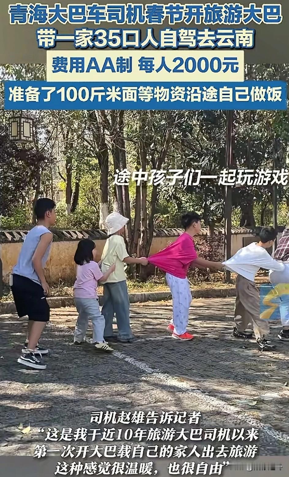 青海一家35口人开大巴春节自驾游![赞] 太让人羡慕了!一大家人有说有笑,边走边玩,自带食材一路自驾南下,分工明确、全程团圆,既有排面,气氛拉满,年味十足呀![鼓掌] 2月11日,据极目新闻报道,司机赵师傅决定与家人过一个不一样的春节,便在家族群里提议,自驾开大巴去云南旅游。 消息一发所有的老人小孩都举手赞成,赵师傅便从自己的公司租了一辆大巴开启旅行之路! 据赵师傅介绍,此次亲友团共有35个人组成,17个孩子,7位老人,11名年轻人组成,年纪最大的75岁,最小的6岁,大部分亲人都没有出过远门,这次算帮他们圆梦了! 此次出行所有的费用都是AA制,每人出2000元,由于弟弟和堂弟条件比较好,他们额外赞助2万元给团队。为了减少开支,他们也提前买了不少食材,大部分都是自己做饭! 一大家人一路上欢声笑语,大合唱,聊家常,还有年轻的弟弟给家人做导游,为孩子和老人讲解着不一样的地方人文风情! 这样的家族大团圆,这样的春节大旅行真让网友们羡慕不已呀!全家春节自驾游 春节自驾用车 大巴车旅游 春节大巴游 春节大巴旅游