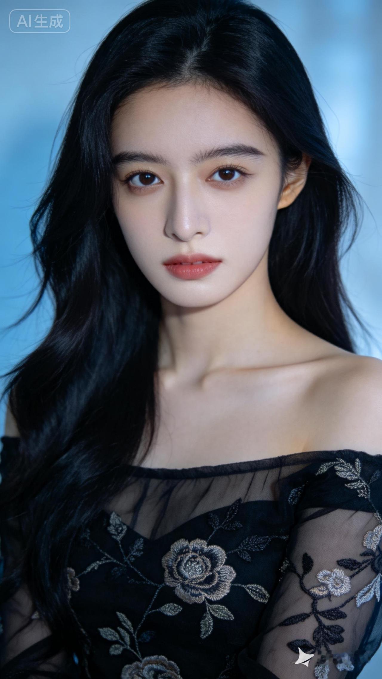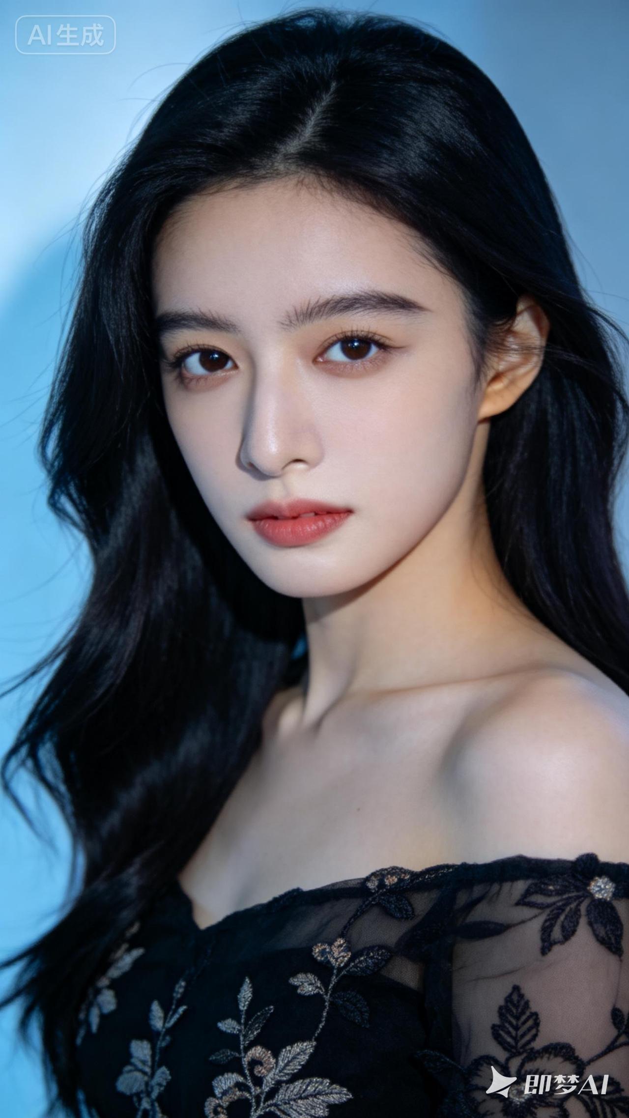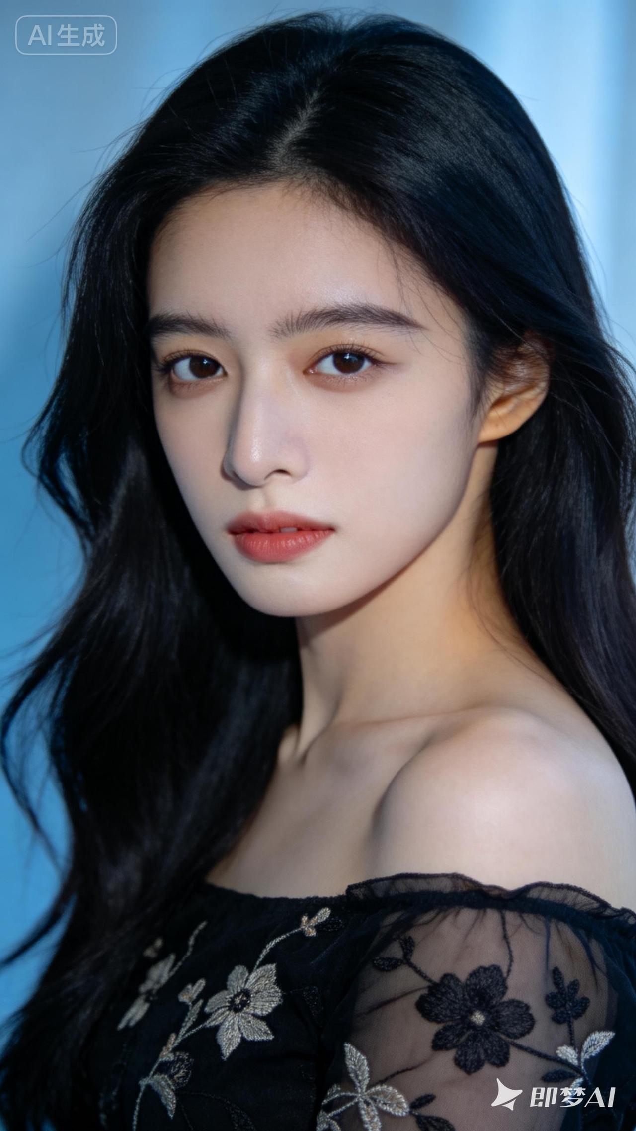 人美,美彤彤,瓜子脸,披肩柔顺黑长发,黑色提花刺绣轻纱衣服一字肩,高清,蓝光,高级,高贵,典雅,秀丽,完美,清纯,优雅