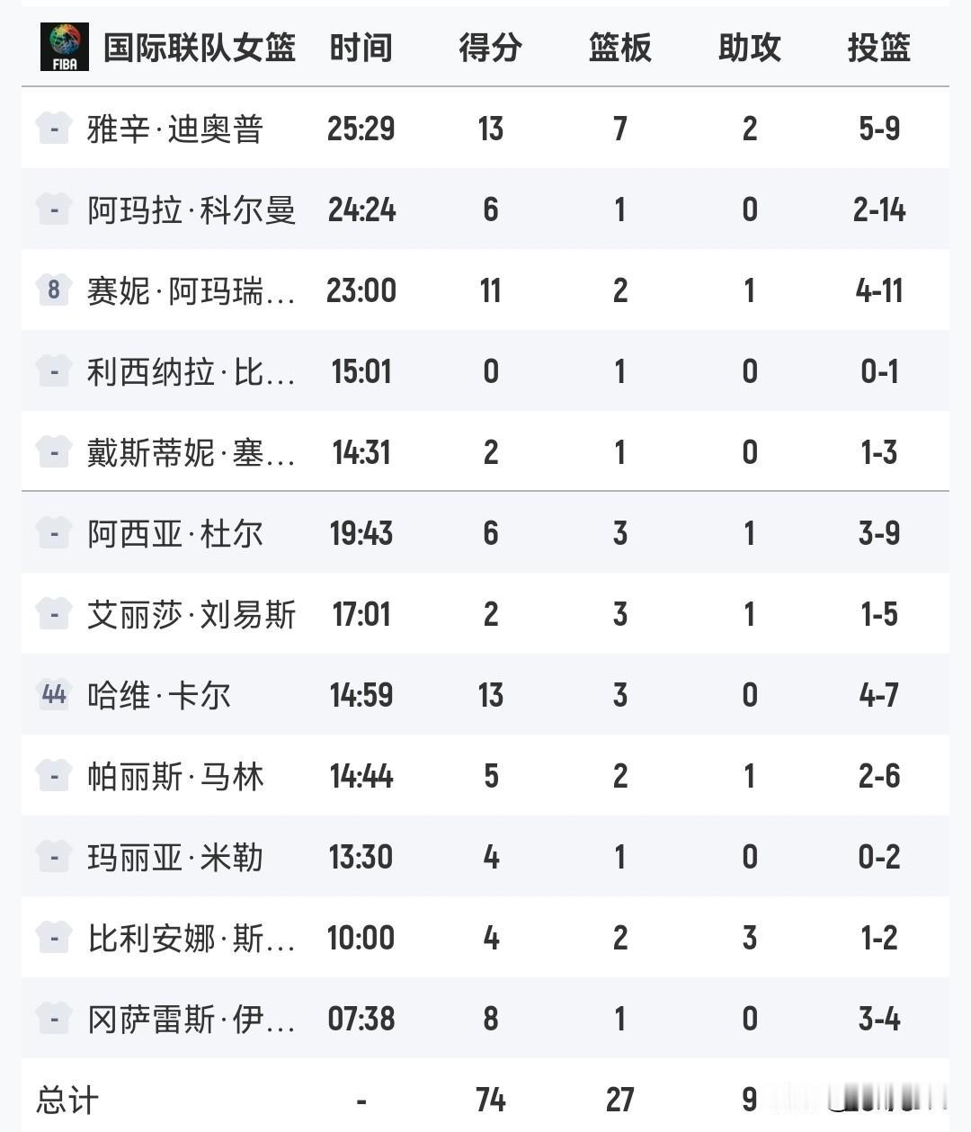 杨舒予14+6 陈明伶21+ 罗欣棫17+ 陈玉洁13+ 中国女篮119-74国