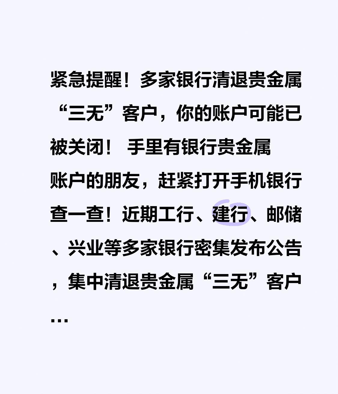 紧急提醒!多家银行清退贵金属“三无”客户,你的账户可能已被关闭! 手里有银行贵金属账户的朋友,赶紧打开手机银行查一查!近期工行、建行、邮储、兴业等多家银行密集发布公告,集中清退贵金属“三无”客户,不少人一觉醒来,发现交易权限被关、资金被原路退回,完全摸不着头脑! 很多人以为“三无”是没资质、没资金、没经验,大错特错!银行定义的“三无”,指无持仓、无库存、无欠款的长期不活跃休眠账户。这类账户长期不用,既没买卖黄金白银,也没有持仓和欠款,却占用系统资源,还暗藏风险,如今被统一清理。 有人说:我账户里还有钱,银行凭什么随便关?放心,银行会把保证金账户余额批量转到你绑定的储蓄卡,不会私吞一分钱。但交易权限一旦关闭,想再开通难上加难!从暂停新开户,到限制交易渠道,再到清理存量账户,银行贵金属业务全面收紧,这不是个别行为,而是全国性的风控升级! 为啥银行突然“一刀切”?近几年金价波动剧烈,贵金属交易属于中高风险业务,不少新手盲目入场亏损惨重。监管要求严格落实投资者适当性管理,银行清理休眠账户,既是降低自身运营风险,也是保护普通投资者,避免大家在不了解规则的情况下盲目交易踩坑。 这件事给所有投资人提了个醒:时代变了,过去随便开个账户就能炒金炒银的日子一去不复返。不管是贵金属、基金还是理财,不懂不投、闲钱投资永远是铁律。长期不用的账户及时注销,既是避免被清理的尴尬,也能守护好自己的金融信息安全。 别等账户被关了才后悔!赶紧检查你的贵金属账户,有持仓的及时关注公告,有余额的尽快转出,长期不用的果断解约。理财道路上,安全永远比收益更重要。你有没有开过贵金属账户?遇到过账户被清理的情况吗?评论区分享提醒更多人!