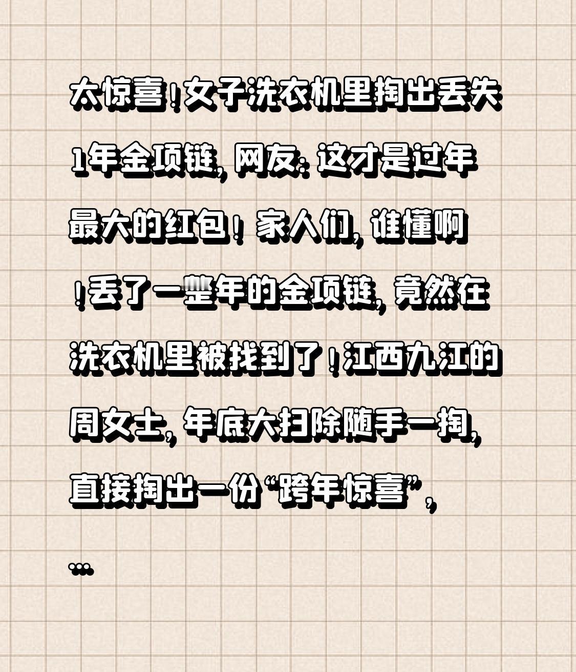 太惊喜!女子洗衣机里掏出丢失1年金项链,网友:这才是过年最大的红包! 家人们,谁懂啊!丢了一整年的金项链,竟然在洗衣机里被找到了!江西九江的周女士,年底大扫除随手一掏,直接掏出一份“跨年惊喜”,看完太治愈了! 一年前,周女士洗衣服时忘了掏口袋,丈夫送的10克金项链就此失踪。她翻遍衣柜、床底、洗衣篮,甚至把家里角角落落都搜了一遍,始终不见踪影。这条项链是丈夫精心挑选的礼物,价值四千多块,丢了之后她又心疼又自责,难过了好一阵子,最后只能接受“永远丢失”的现实。 本以为这件事就这么翻篇了,没想到命运藏了个大反转!年底大扫除,周女士想着清理一下洗衣机底部的排污口,这个平时被忽略的小角落,藏满了毛絮和污垢。她伸手一摸,摸到个硬邦邦的小东西,本以为是硬币或发卡,擦干净灰尘一看,瞬间愣住——正是那条丢失一整年的金项链! 项链被卡在排污口,完好无损、金光闪闪,仿佛从未离开。周女士又惊又喜,直呼太幸运:“要是没清理,等洗衣机坏了被回收,就真的找不回来了!” 这件事瞬间引爆全网,网友们纷纷留言共鸣:“我丢过耳钉、戒指,原来都藏在洗衣机里!”“大扫除=寻宝游戏,这才是过年最开心的事!” 其实生活里的小美好,往往藏在不经意间。一条失而复得的项链,不仅是钱财的回归,更是一份温暖的惊喜,治愈了一整年的疲惫。它也提醒我们,洗衣前一定要掏干净口袋,定期清理洗衣机排污口,既能守护健康,还能找回意外丢失的宝贝。 旧物重逢,万事可期。新的一年,愿所有遗憾都能圆满,所有丢失的美好,都能以另一种方式归来。你有没有过失而复得的惊喜?评论区分享你的故事,沾沾这份好运气!