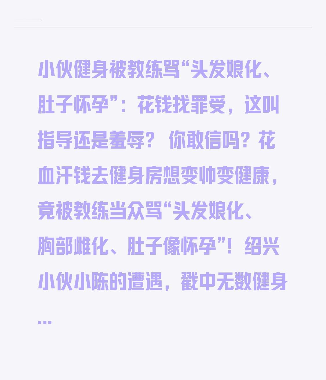 小伙健身被教练骂“头发娘化、肚子怀孕”:花钱找罪受,这叫指导还是羞辱? 你敢信吗?花血汗钱去健身房想变帅变健康,竟被教练当众骂“头发娘化、胸部雌化、肚子像怀孕”!绍兴小伙小陈的遭遇,戳中无数健身人的痛处,看完又气又心疼! 小陈办了健身月卡,本想好好锻炼改变自己,却因一次器械使用和教练起了争执。本以为是正常沟通,没想到教练口无遮拦,句句戳心,把人身攻击当“专业指导”。小伙又委屈又愤怒,自己只是想健身,凭什么要承受这样的恶意? 更让人无语的是,面对指责,教练还矢口否认,改口说只说小伙“像个球球”,甚至倒打一耙称是小伙先语言攻击。没有录音难辨对错,但不管谁先起冲突,用外貌羞辱、性别刻板印象骂人,本身就跌破底线! 健身圈里,这种“打压式教学”太常见了。多少人去健身房,被教练嫌身材差、嫌动作丑,用刻薄话打击自信;多少新手想坚持锻炼,却被冷嘲热讽逼得不敢再去。花钱办卡、买私教,不是为了听难听的话,更不是为了被贬低、被羞辱! 真正的教练,是耐心纠正动作、鼓励坚持、帮人突破自我;而不是仗着身份,把刻薄当严厉,把羞辱当负责。头发长短是个人审美,身材胖瘦可以慢慢改变,谁都不是天生完美,凭什么被随意贴标签、恶语相向? 良言一句三冬暖,恶语伤人六月寒。健身是为了遇见更好的自己,服务行业更该守住尊重的底线。不管是健身教练,还是日常相处,好好说话、尊重他人,才是最基本的修养。 别让“打压式指导”毁了健身的意义,别让恶意言语伤了努力的心。你在健身房遇到过奇葩教练吗?受过这样的委屈吗?评论区聊聊,为所有被恶意对待的健身人发声!