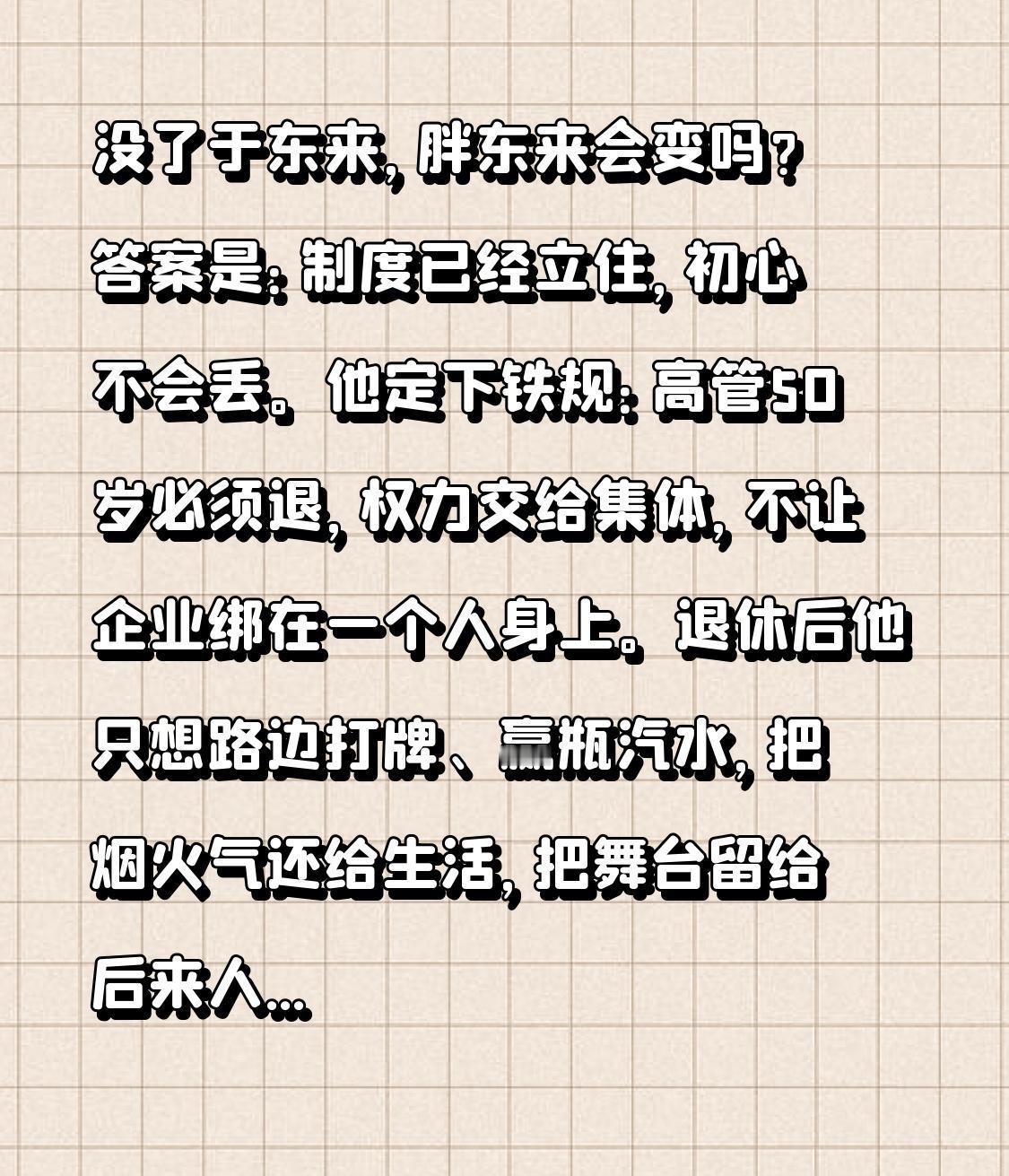 于东来官宣退休!胖东来告别创始人时代,一句话看哭14亿人 重磅突发!南方小年这天,60岁于东来正式宣布:春节后退休,转为顾问,日常经营交给决策委员会!一个把超市做成“人间理想”的男人,选择在巅峰时从容退场,全网破防:这才是企业家最好的样子! 很多人不解:胖东来正火,为啥急着退休?于东来说得直白:六十而退,让年轻人挑大梁。早在2023年他就逐步放权,80%经营不再插手;这次彻底交棒,不是放弃,是对团队最大的信任,更是要把胖东来从“人治”带进“制度治”。 回顾这30年,于东来把小杂货铺做成零售乌托邦:员工带薪年假40天、工资高于行业几倍、受伤有兜底、离职有尊重;对顾客,免费修鞋、免费饮水、投诉必处理、缺斤短两十倍赔。不加盟、不扩张、不赚黑心钱,在资本狂飙、商超内卷的年代,胖东来守住了最朴素的良心。 转折来了!大家担心:没了于东来,胖东来会变吗?答案是:制度已经立住,初心不会丢。他定下铁规:高管50岁必须退,权力交给集体,不让企业绑在一个人身上。退休后他只想路边打牌、赢瓶汽水,把烟火气还给生活,把舞台留给后来人。 于东来最打动人的,从不是生意有多成功,而是把人当人。对员工不压榨,对顾客不套路,对社会有担当。在这个逐利的时代,他用一家超市,证明商业可以有温度、有底线、有良心。 一代人退场,一种精神传承。退休不是终点,是胖东来新的开始。谢谢你,于东来,让我们相信:好好做人、认真做事,永远不过时。 你去过胖东来吗?最打动你的是哪件小事?评论区致敬这位良心企业家,愿胖东来永远温暖,愿更多商家守住初心!