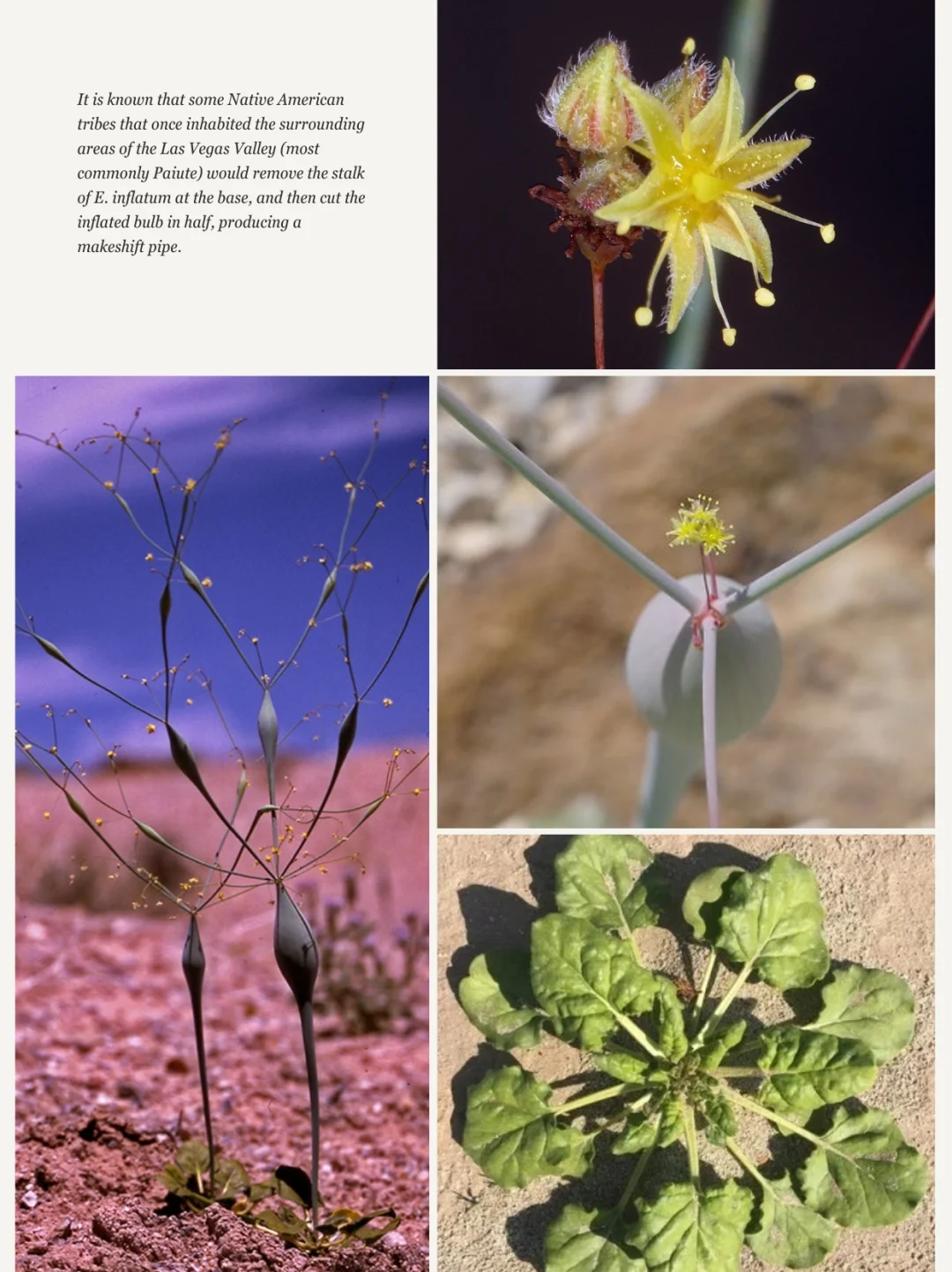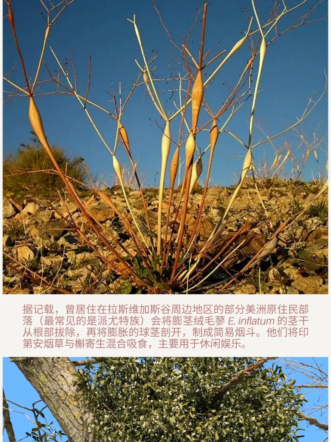 据记载,曾居住在拉斯维加斯谷周边地区的部分美洲原住民部落(最常见的是派尤特族)会将膨茎绒毛蓼 E. inflatum 的茎干从根部拔除,再将膨胀的球茎剖开,制成简易烟斗。他们将印第安烟草与槲寄生混合吸食,主要用于休闲娱乐。蓼科 苞蓼属 膨茎绒毛蓼 Eriogonum inflatum