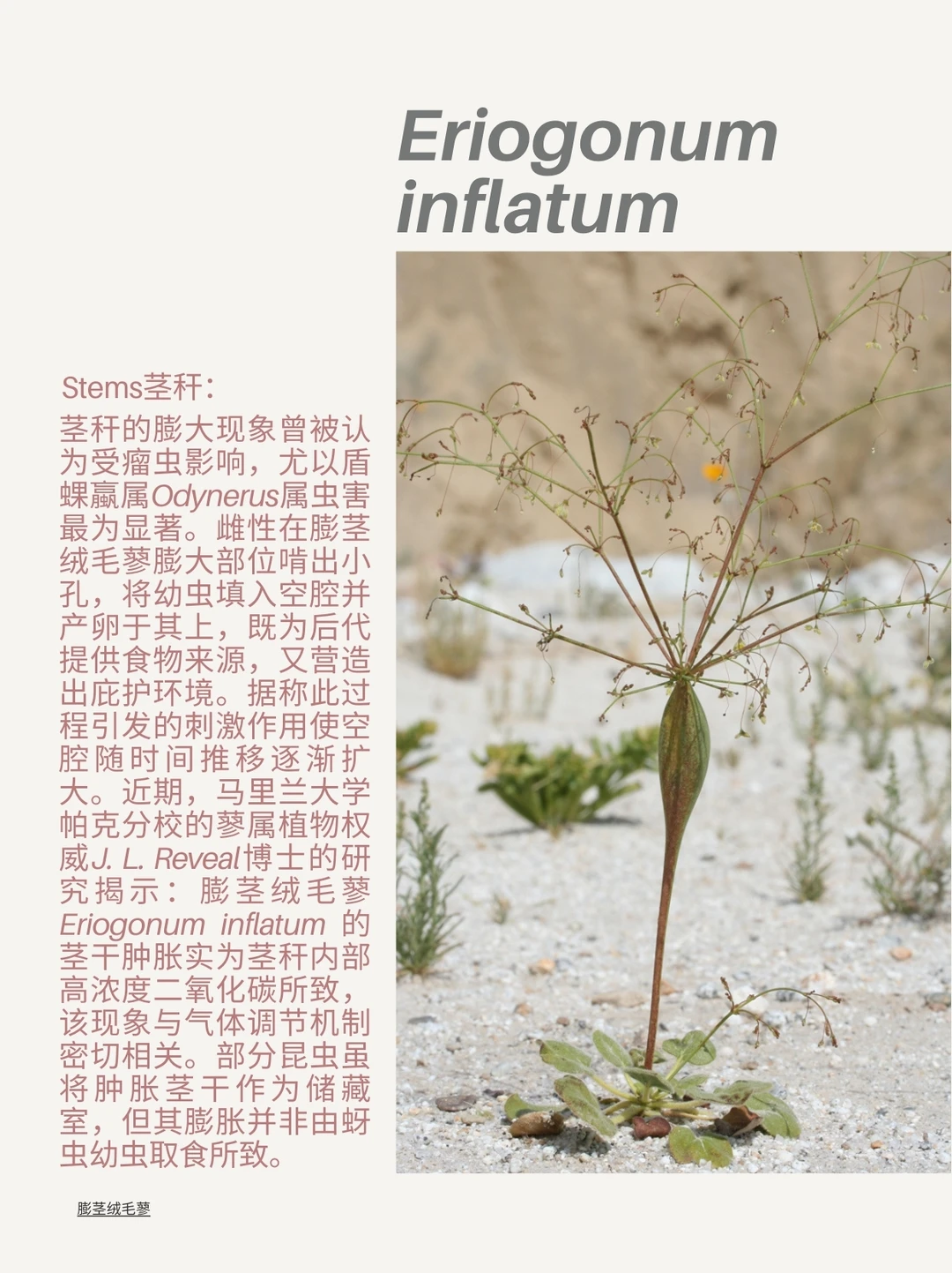 茎秆的膨大现象曾被认为受瘤虫影响,尤以盾蜾蠃属Odynerus属虫害最为显著。雌性在膨茎绒毛蓼膨大部位啃出小孔,将幼虫填入空腔并产卵于其上,既为后代提供食物来源,又营造出庇护环境。据称此过程引发的刺激作用使空腔随时间推移逐渐扩大。近期,马里兰大学帕克分校的蓼属植物权威J. L. Reveal博士的研究揭示:膨茎绒毛蓼 Eriogonum inflatum 的茎干肿胀实为茎秆内部高浓度二氧化碳所致,该现象与气体调节机制密切相关。部分昆虫虽将肿胀茎干作为储藏室,但其膨胀并非由蚜虫幼虫取食所致。