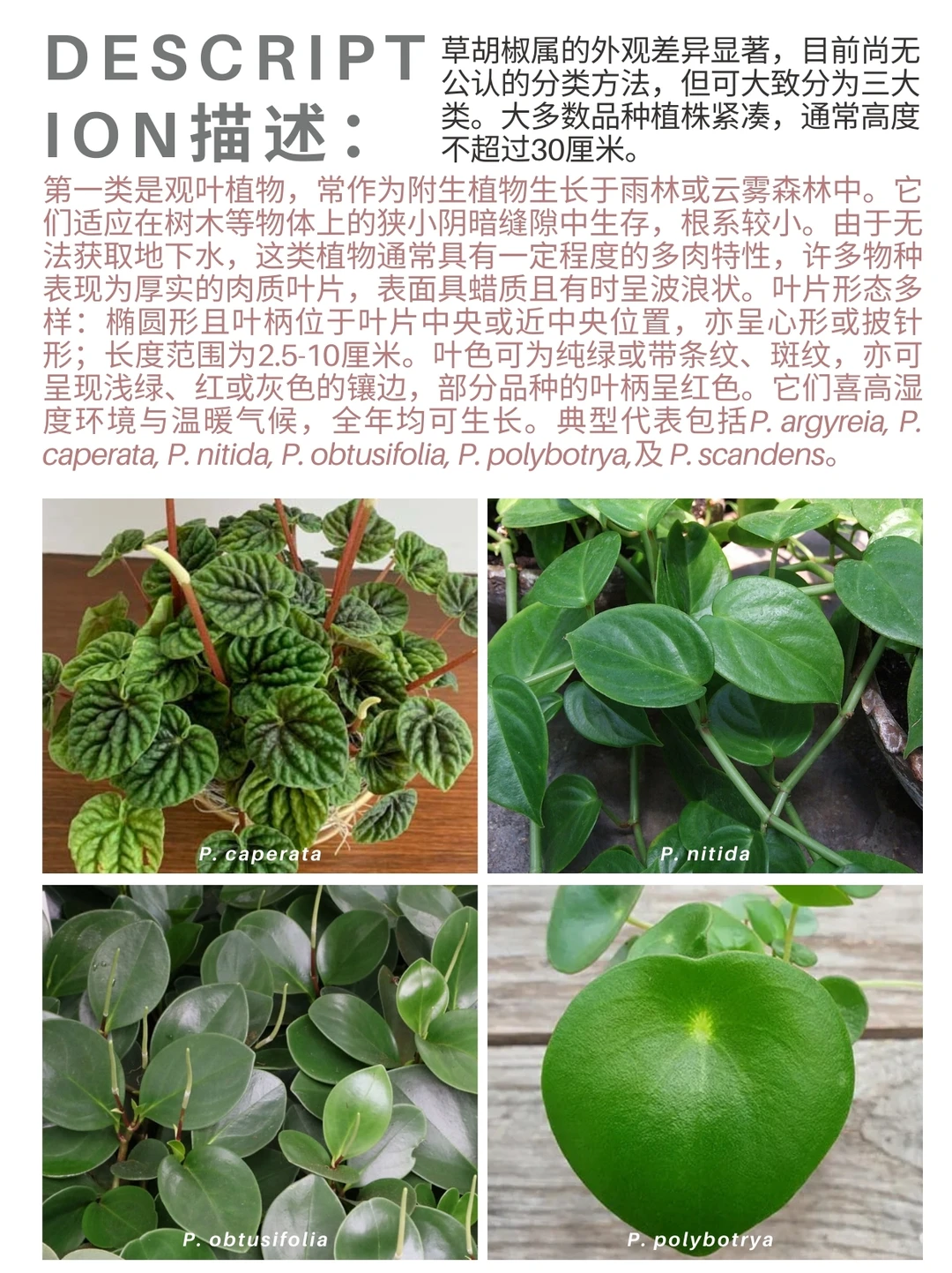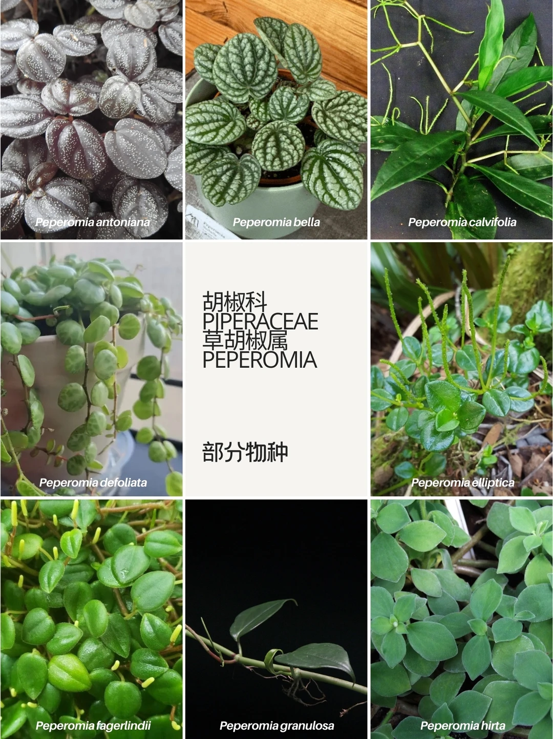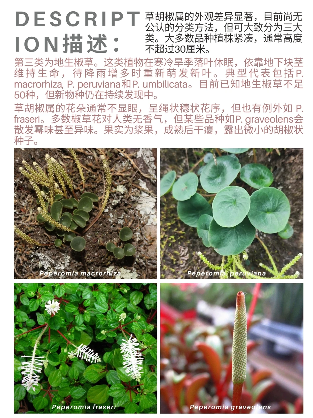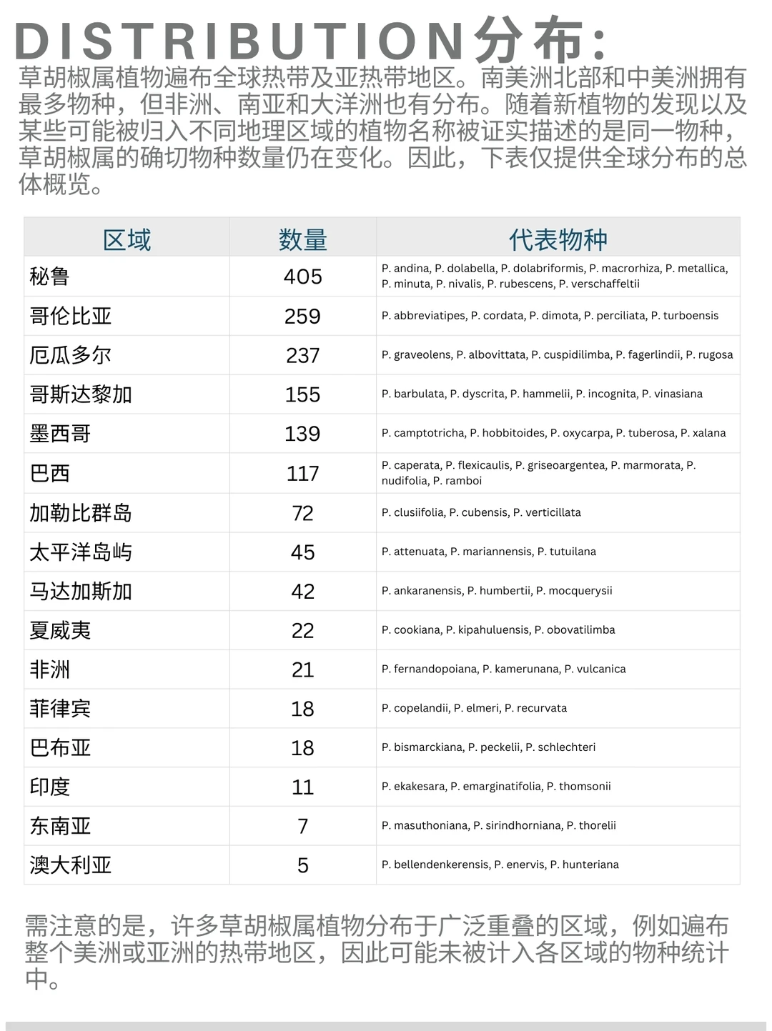 草胡椒属是胡椒科两大属之一,据估算拥有超过1000个物种,分布于全球所有热带及亚热带地区。其主要集中于南美洲和中美洲,但也见于北美洲南部、加勒比群岛、非洲、大洋洲以及亚洲南部和东部地区。确切物种数量难以确定,因部分植物曾以不同名称重复记录,且新物种仍在持续发现中。草胡椒属植物适应了多种环境,形态差异显著。部分为附生植物(附着于其他植物上)或石生植物(生长于岩石或岩缝中),许多具有耐旱特性(通过肥厚多肉组织储水)或形成地下块茎(地生植物)。多数物种为紧凑型多年生灌木或藤本植物。