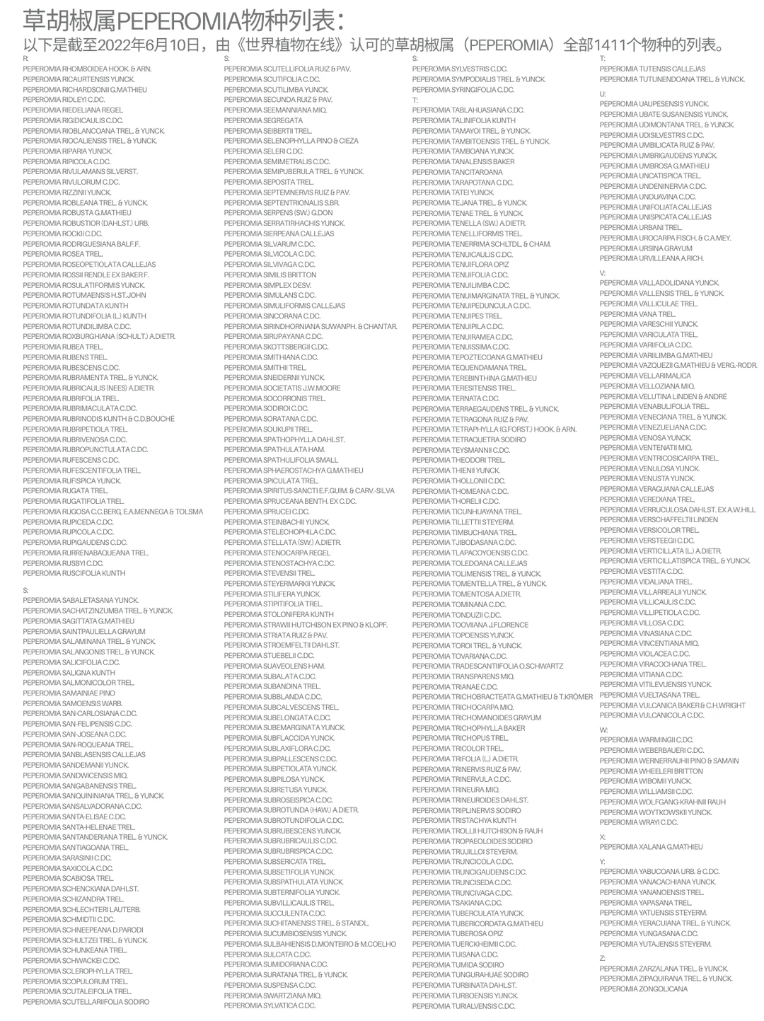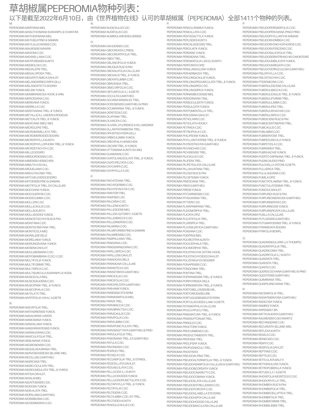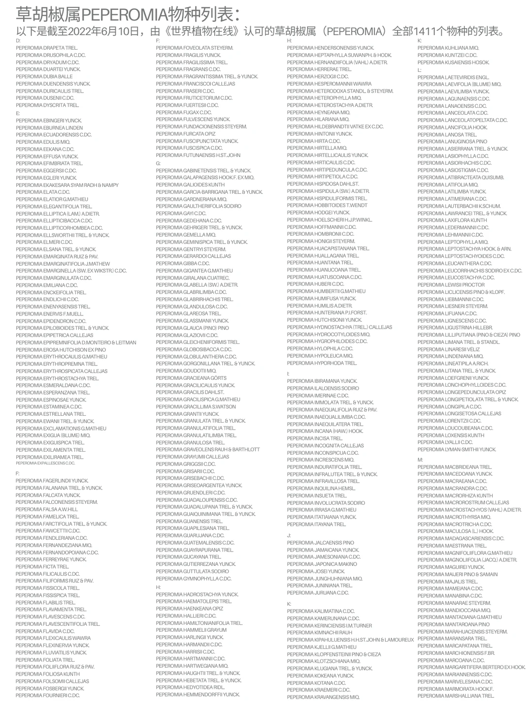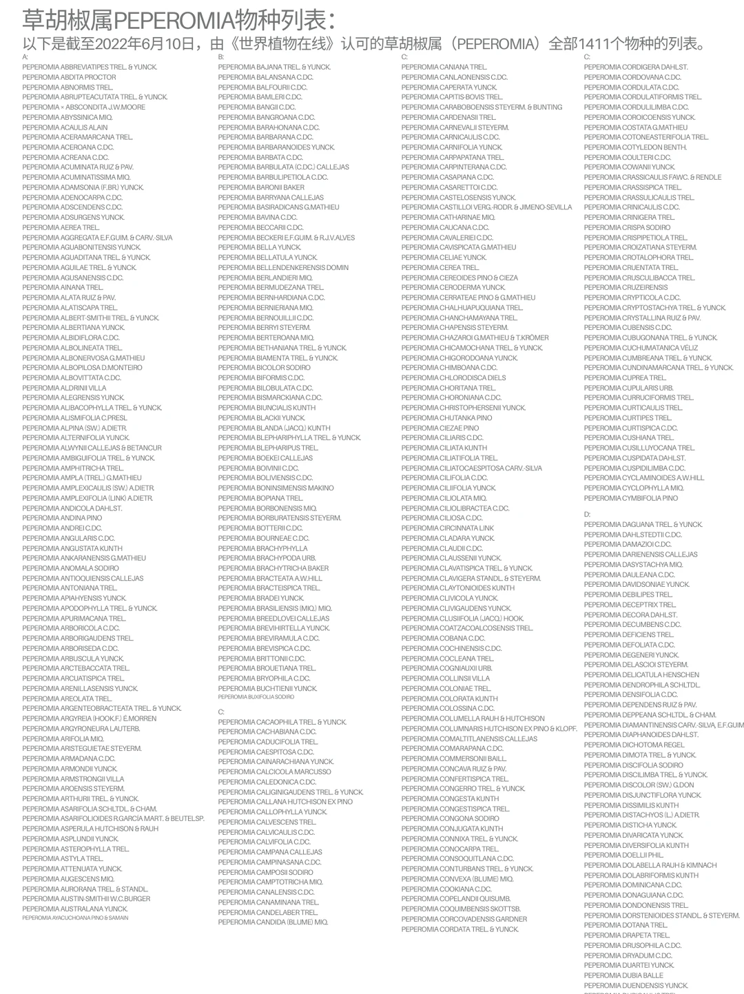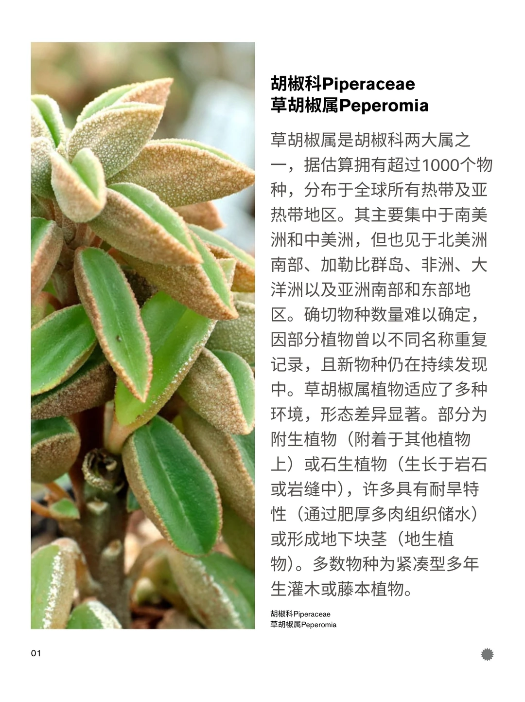 草胡椒属是胡椒科两大属之一,据估算拥有超过1000个物种,分布于全球所有热带及亚热带地区。其主要集中于南美洲和中美洲,但也见于北美洲南部、加勒比群岛、非洲、大洋洲以及亚洲南部和东部地区。确切物种数量难以确定,因部分植物曾以不同名称重复记录,且新物种仍在持续发现中。草胡椒属植物适应了多种环境,形态差异显著。部分为附生植物(附着于其他植物上)或石生植物(生长于岩石或岩缝中),许多具有耐旱特性(通过肥厚多肉组织储水)或形成地下块茎(地生植物)。多数物种为紧凑型多年生灌木或藤本植物。
